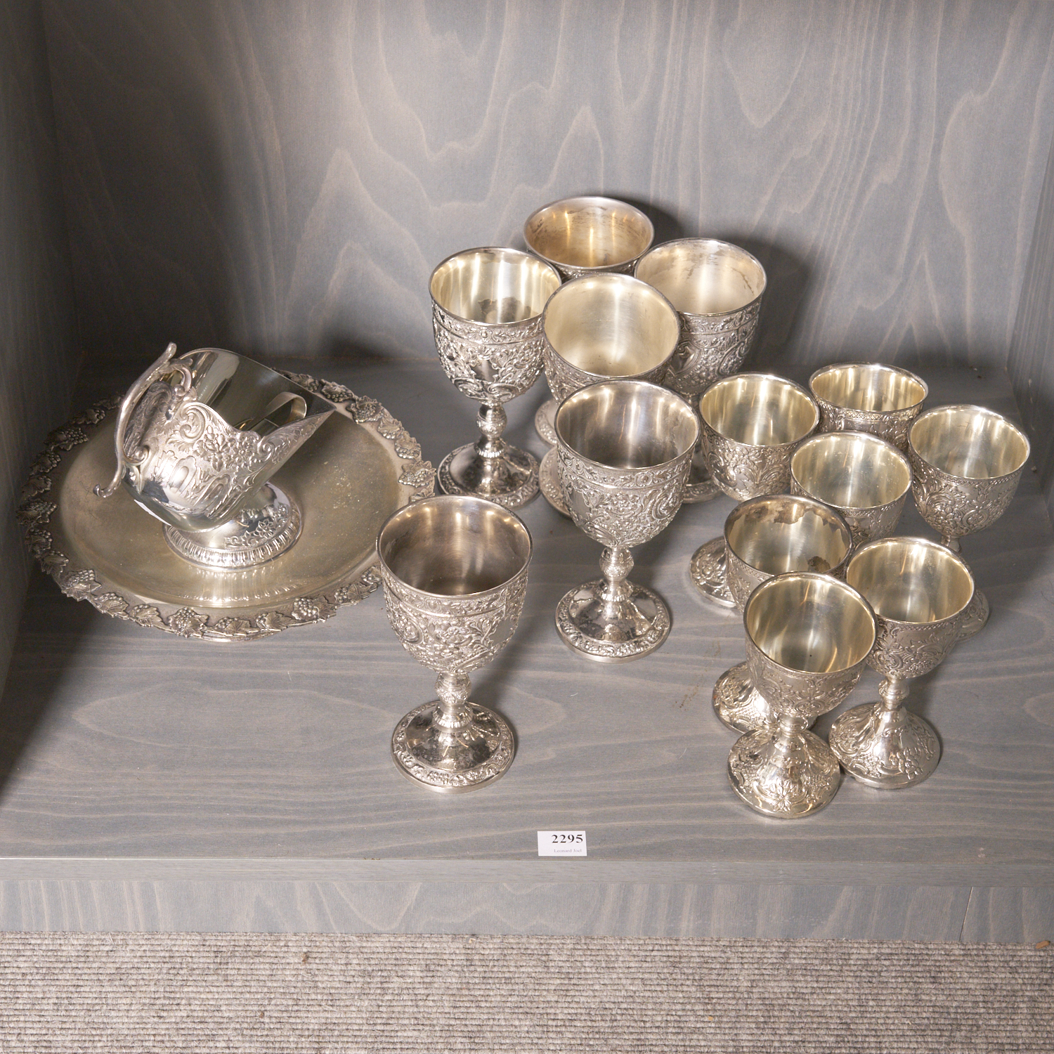 TWO SETS OF SILVER PLATE WINE GOBLETS TOGETHER WITH A SIMILAR SERVING WARE H.15CM (TALLEST GOBLET)