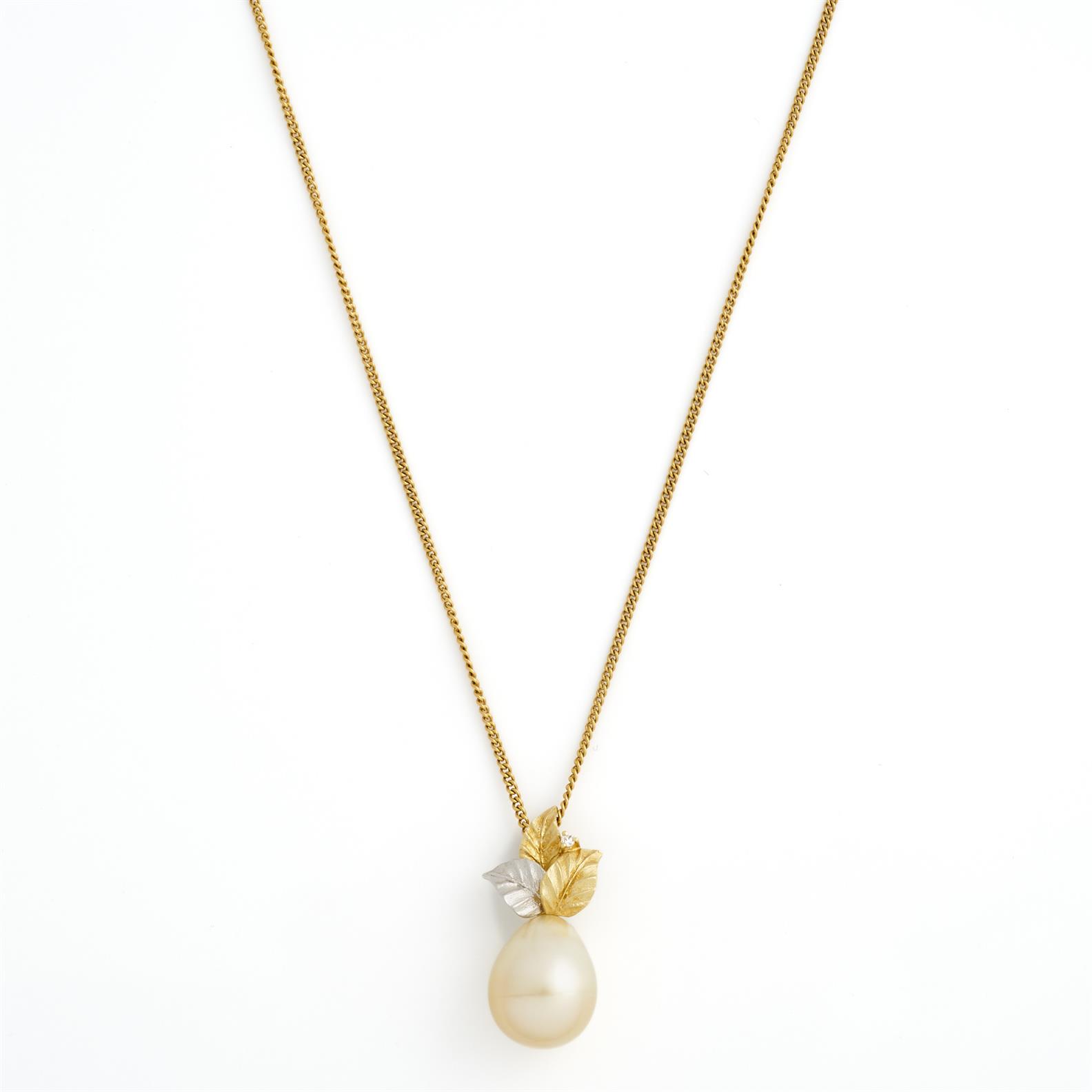 A GOLDEN SOUTH SEA PEARL AND DIAMOND PENDANT IN 18CT GOLD, THE PEARL MEASURING 15.5 X 13.7MM, TO A DISPLAY CHAIN