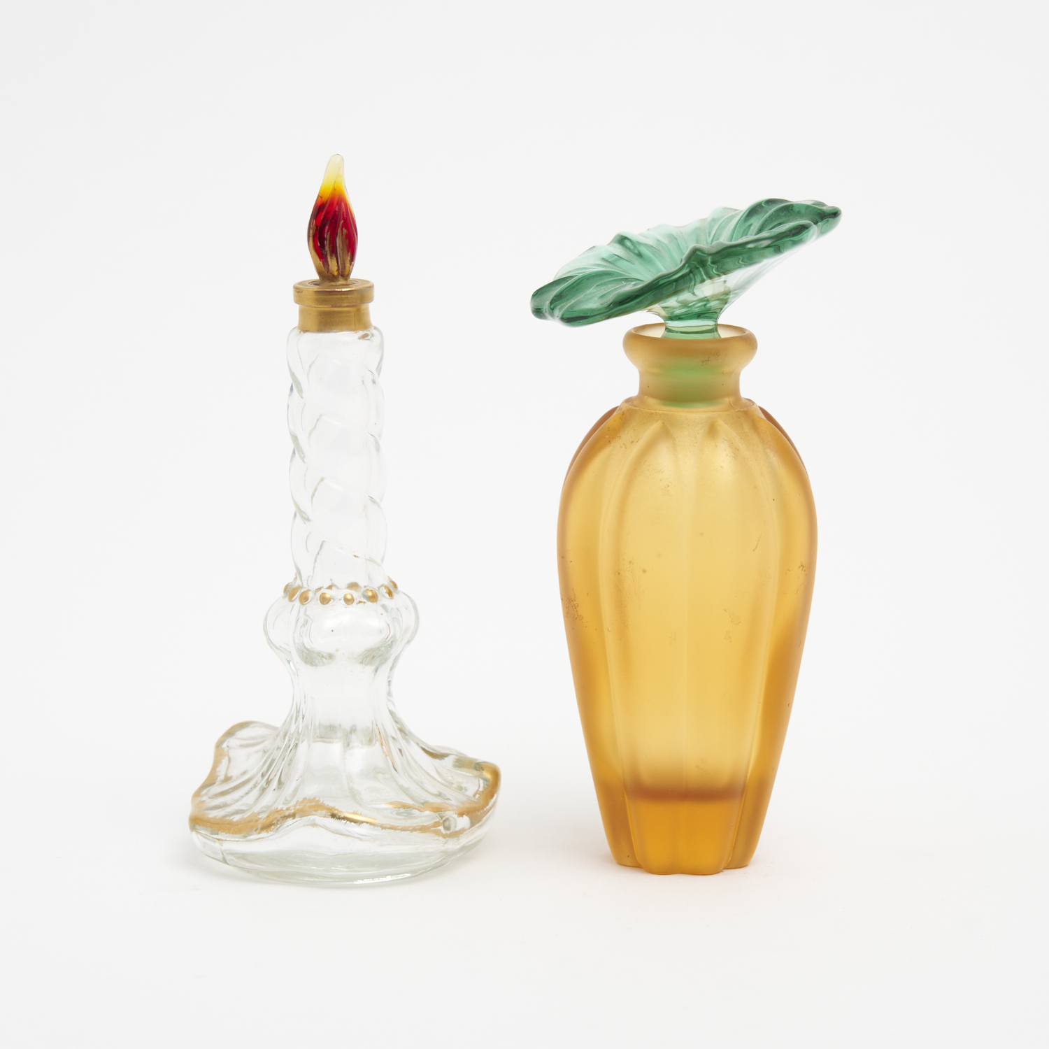 A SCHIAPARELLI PERFUME BOTTLE (REMNANT LABLE) AND A FRENCH FROSTED GLASS PERFUME BOTTLE WITH FLOWER FORM STOPPER H.16.5CM (TALLEST)