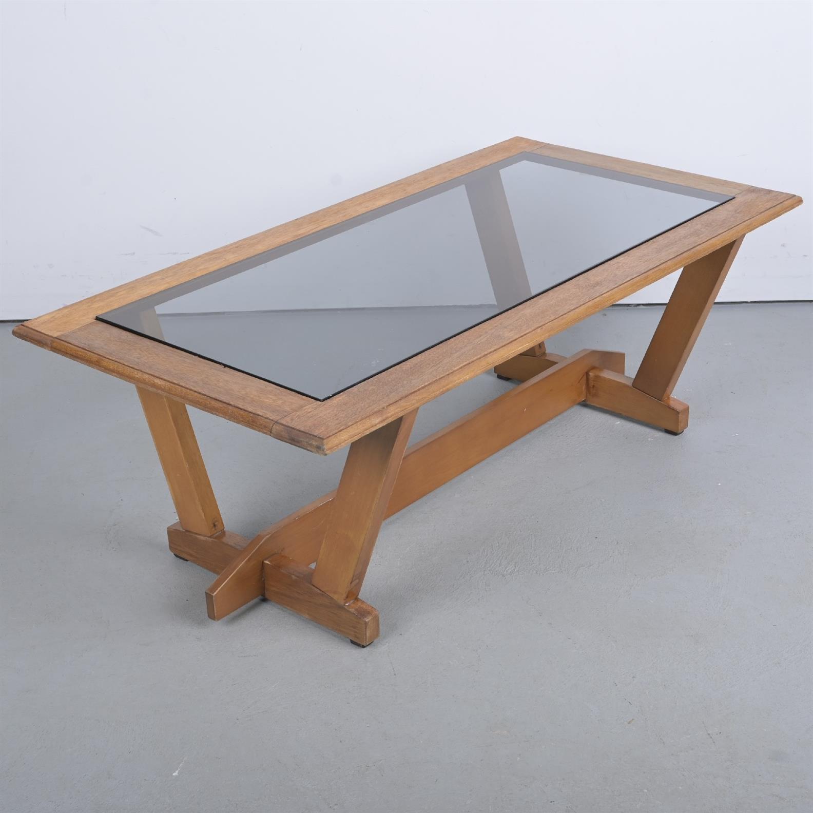 A HARDWOOD COFFEE TABLE WITH INSET GLASS TOP (43H X 120W X 62D CM)