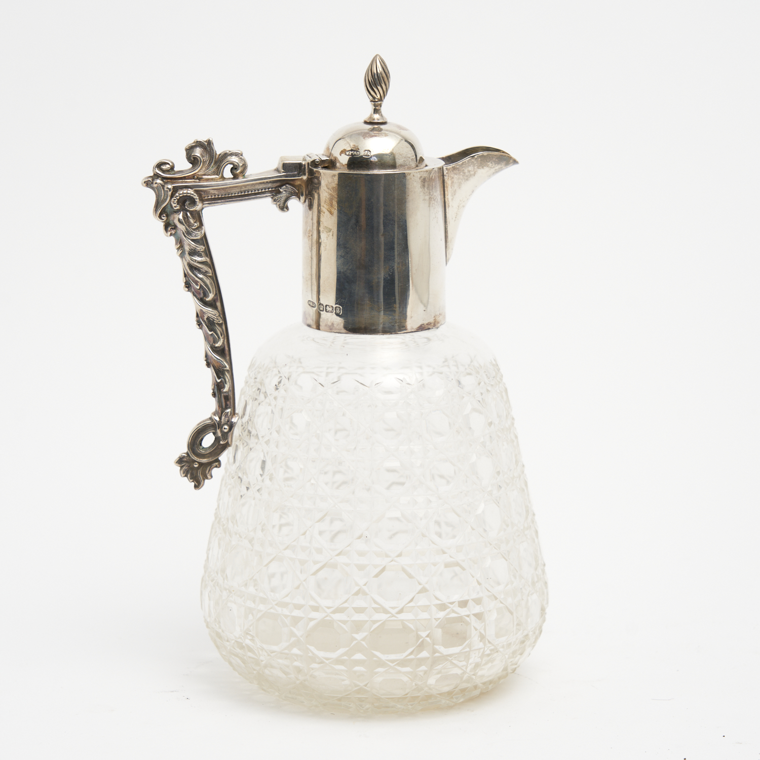 A STERLING SILVER MOUNTED CUT CRYSTAL CLARET JUG H.24CM