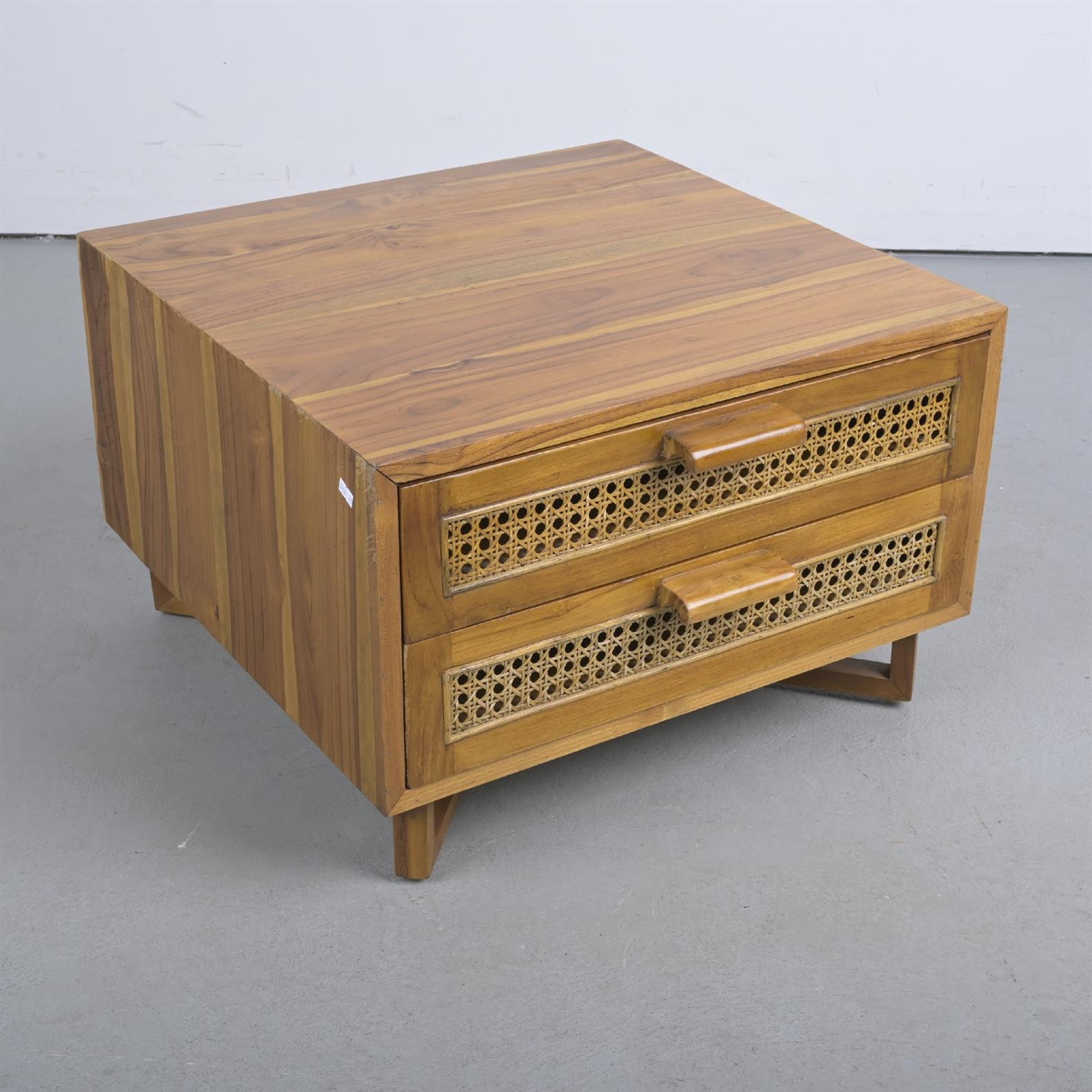 A TEAK LOW BEDSIDE CHEST, THE DRAWERS WITH SPLIT CANE FRONTS (40H X 61W X 64D CM)
