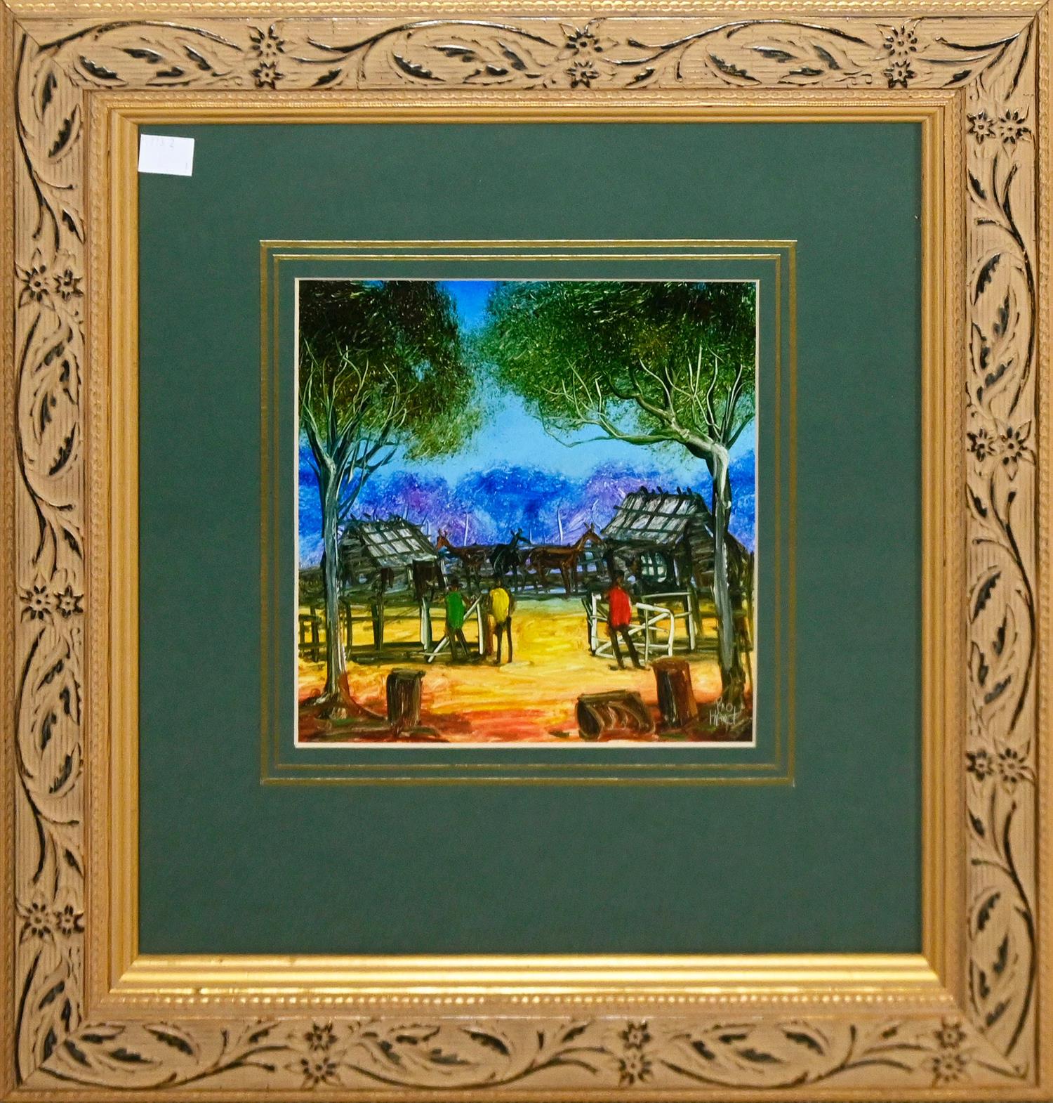 OIL ON BOARD, SIGNED PRO HART LOWER RIGHT, 19.5 X 19.5CM, FRAME SIZE: 45 X 47CM