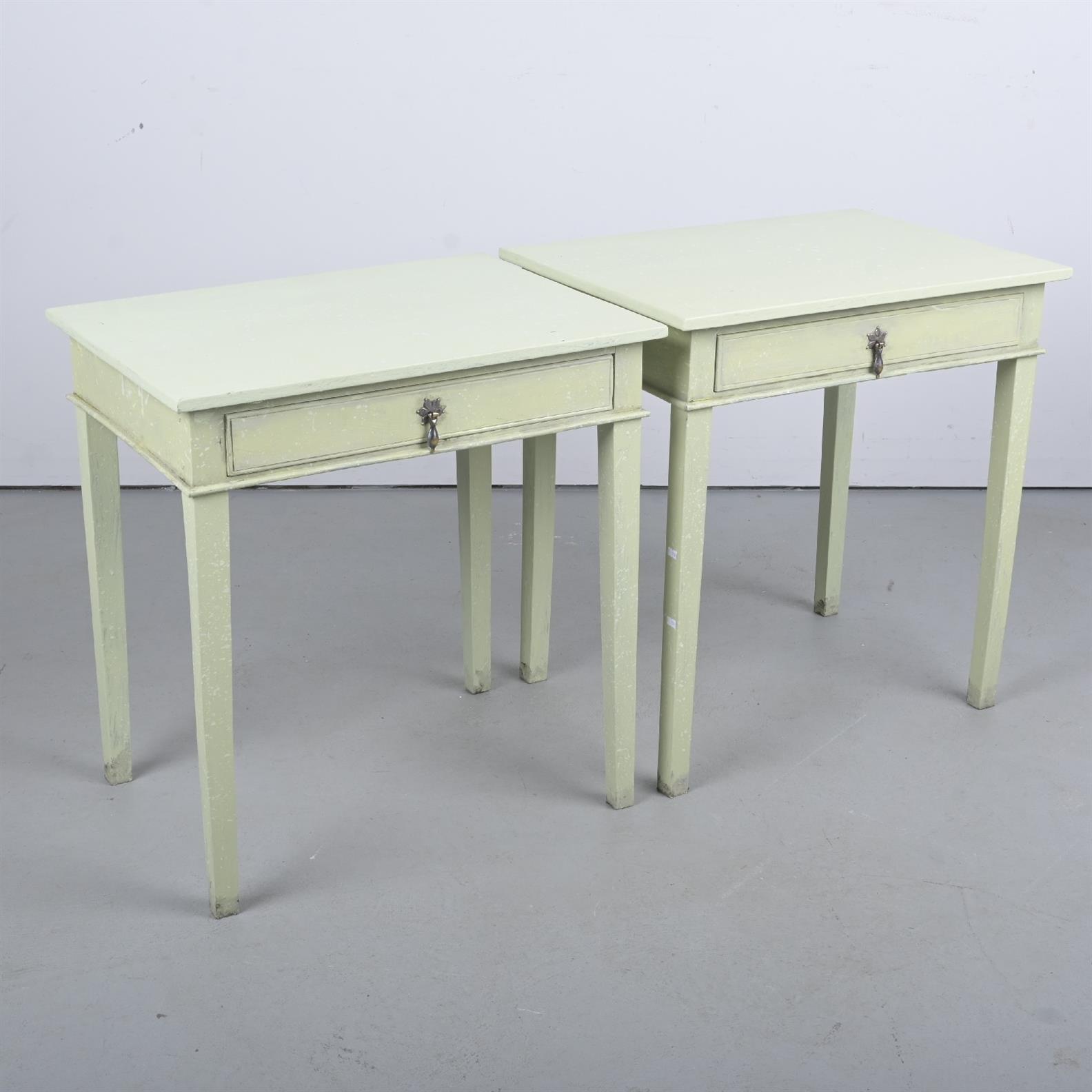 A PAIR OF GEORGIAN-STYLE SIDE TABLES, PAINTED IN APPLE GREEN (A/F) (68H X 65W X 50D CM)