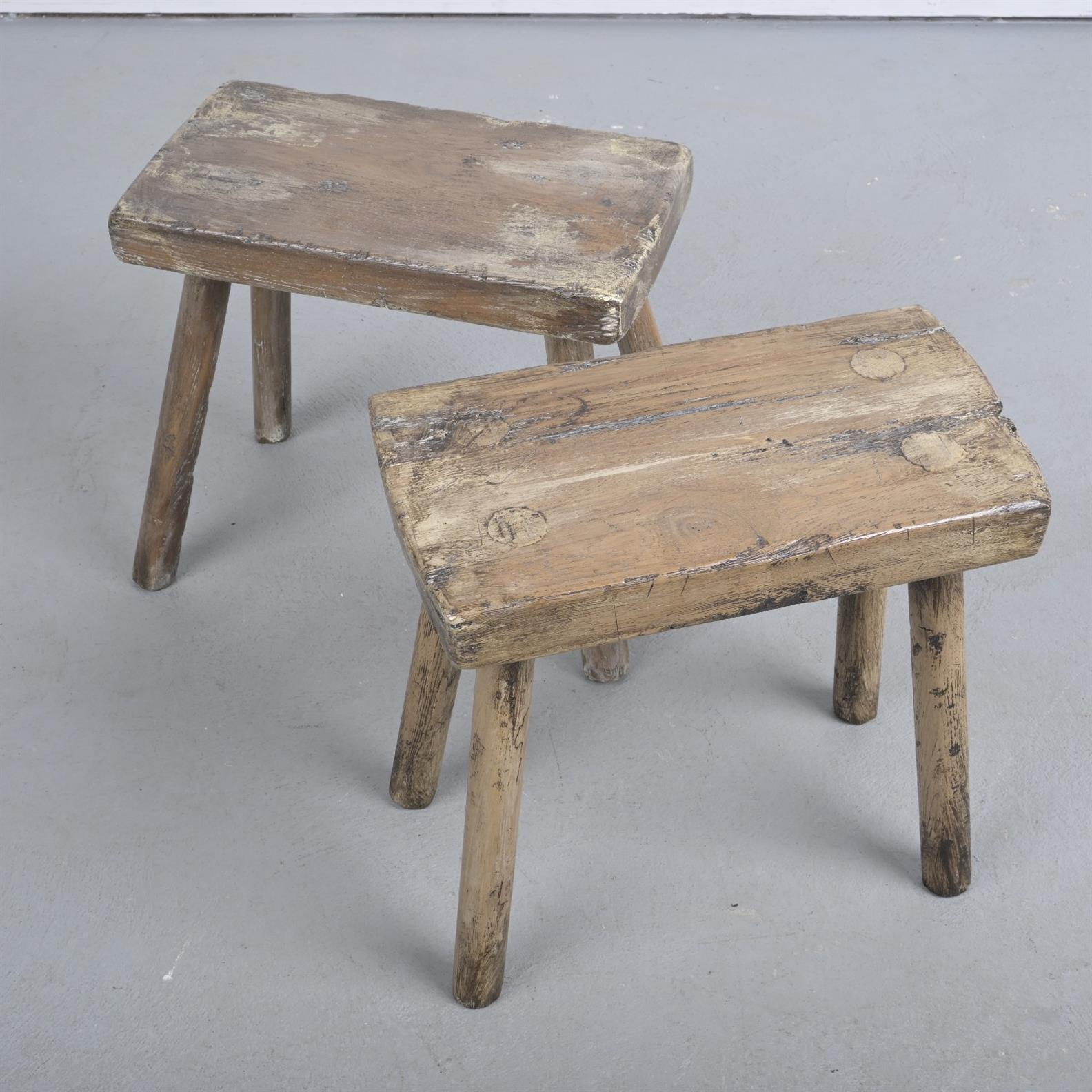 A PAIR OF OAK MILKING STOOLS (38H X 40W X 22D CM)