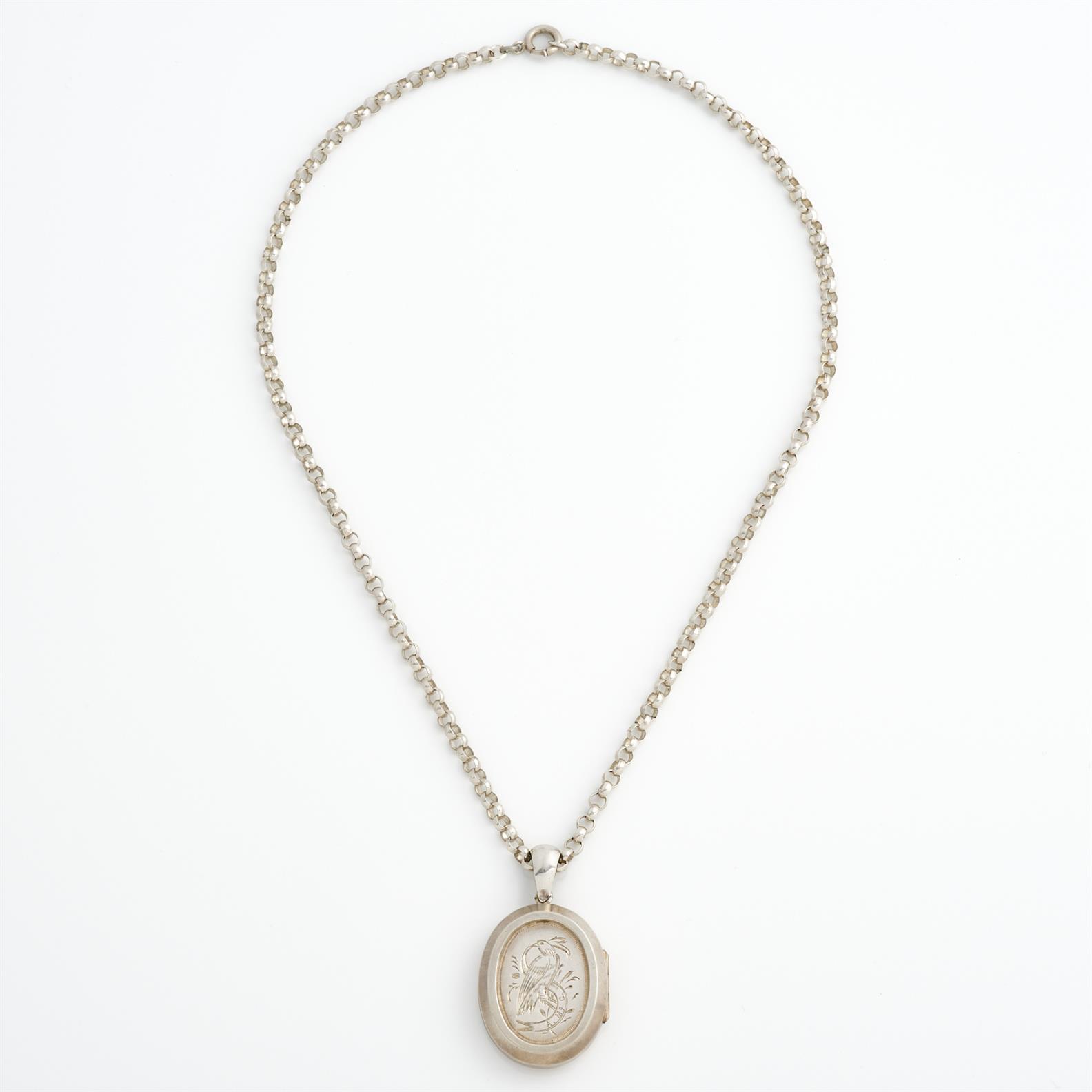 A VICTORIAN LOCKET TO A CHAIN IN SILVER, THE LOCKET MEASURING 40 X 30MM, CHAIN LENGTH 500MM