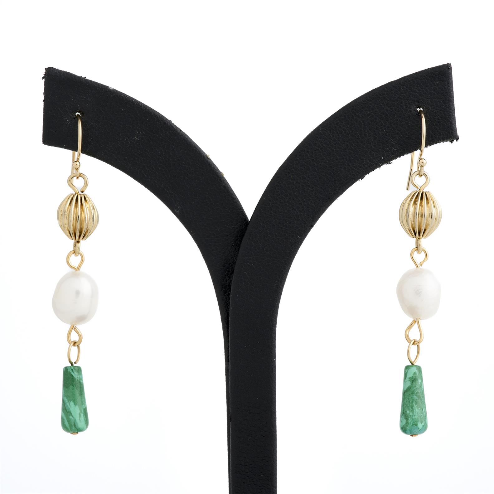 A PAIR OF VINTAGE MALACHITE AND PEARL DROP EARRINGS, LENGTH 55MM