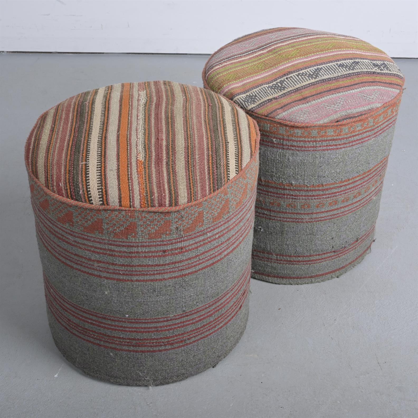 A PAIR OF UPHOLSTERED CIRCULAR FOOT STOOLS (A/F) (50H X 47DIA CM)
