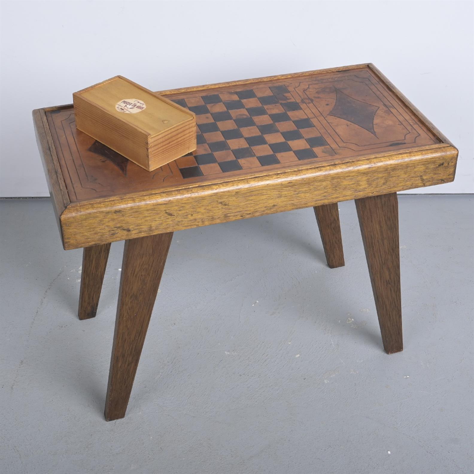 A1960s AUSTRALIAN LEATHER TOPPED CHESS TABLE WITH WOODEN CHESS PIECES (A/F) (47H X 66W X 34D CM)