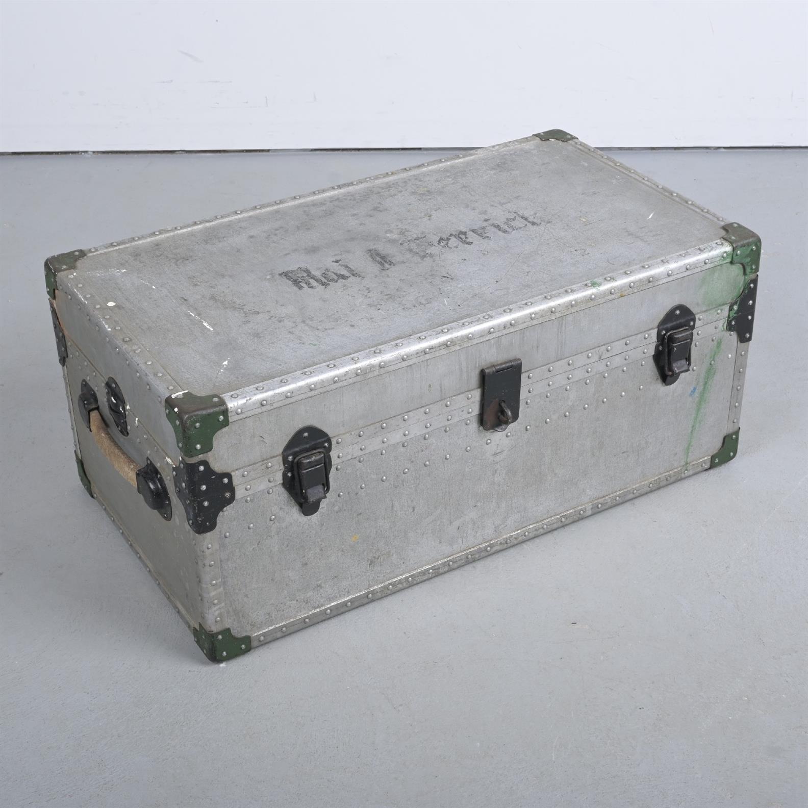 AN ALUMINIUM LEATHER HANDLED TRAVELLING TRUNK (34H X 78W X 43D CM)