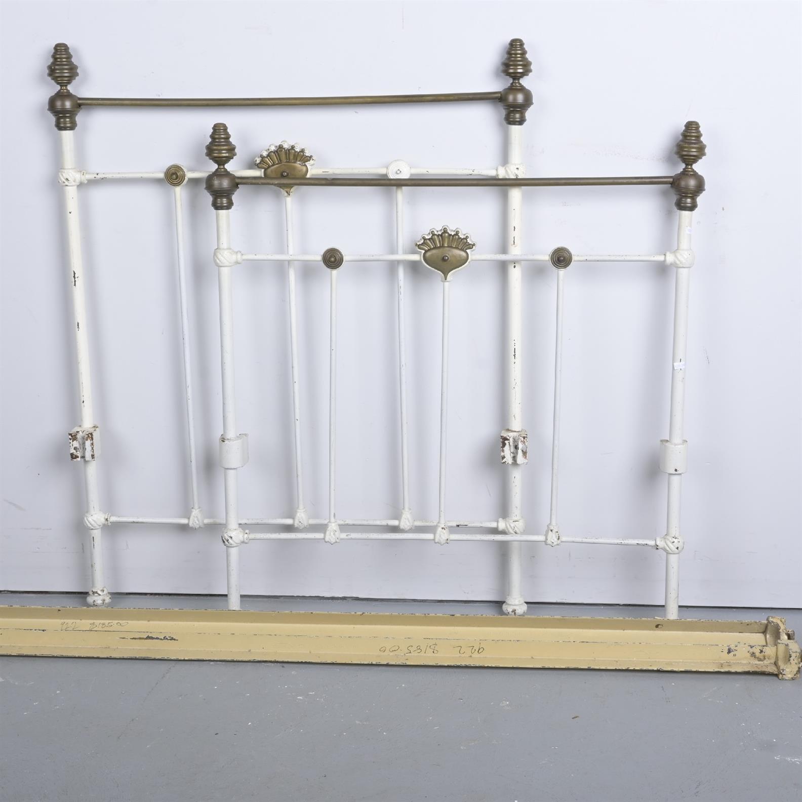 A LATE 19TH CENTURY CAST IRON AND BRASS SINGLE BED FRAME WITH RAILS (A/F) (BEDHEAD 115H X 95W CM)