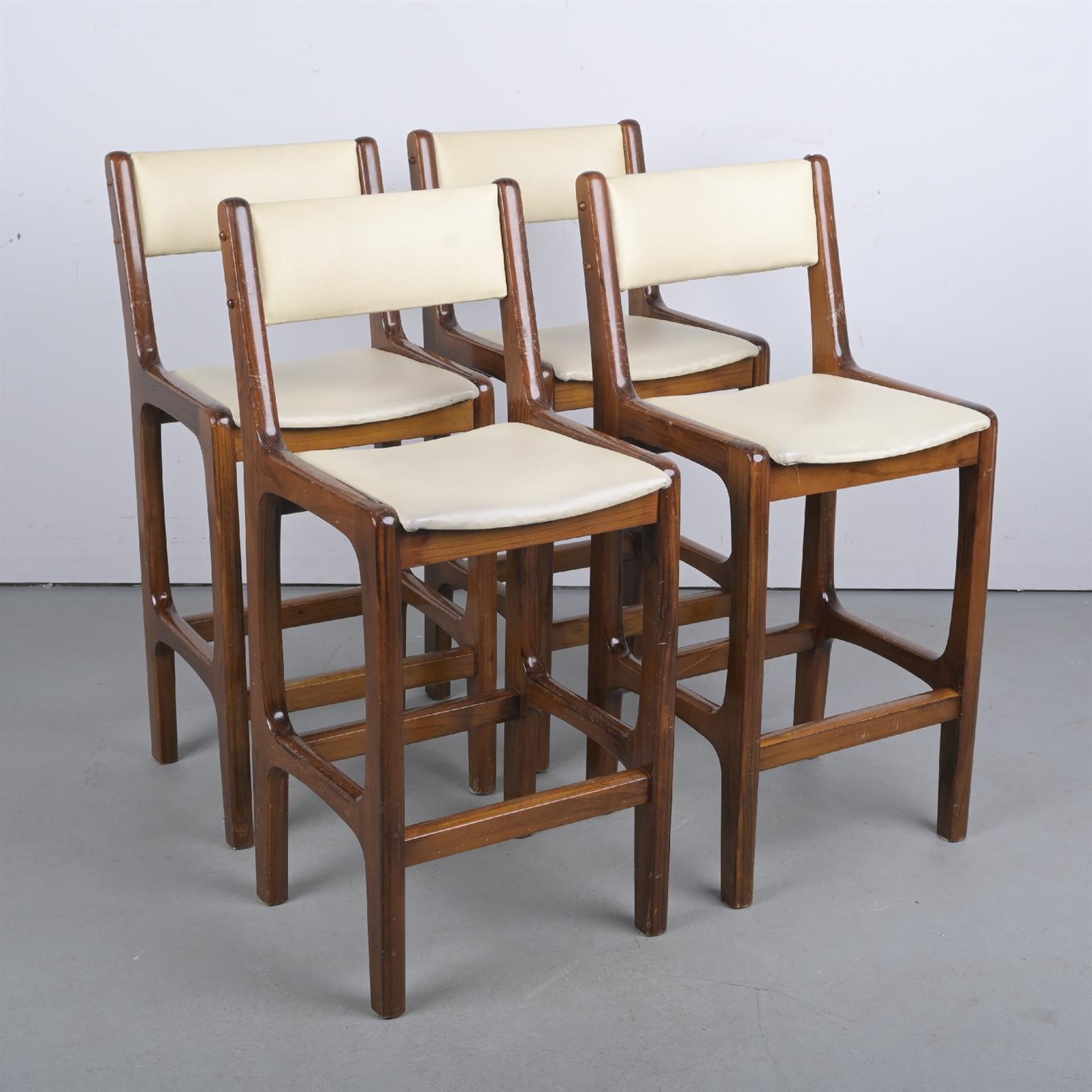FOUR HIGH BACK BAR STOOLS, UPHOLSTERD IN CREAM LEATHER (A/F) (100H X 45W X 42D CM)