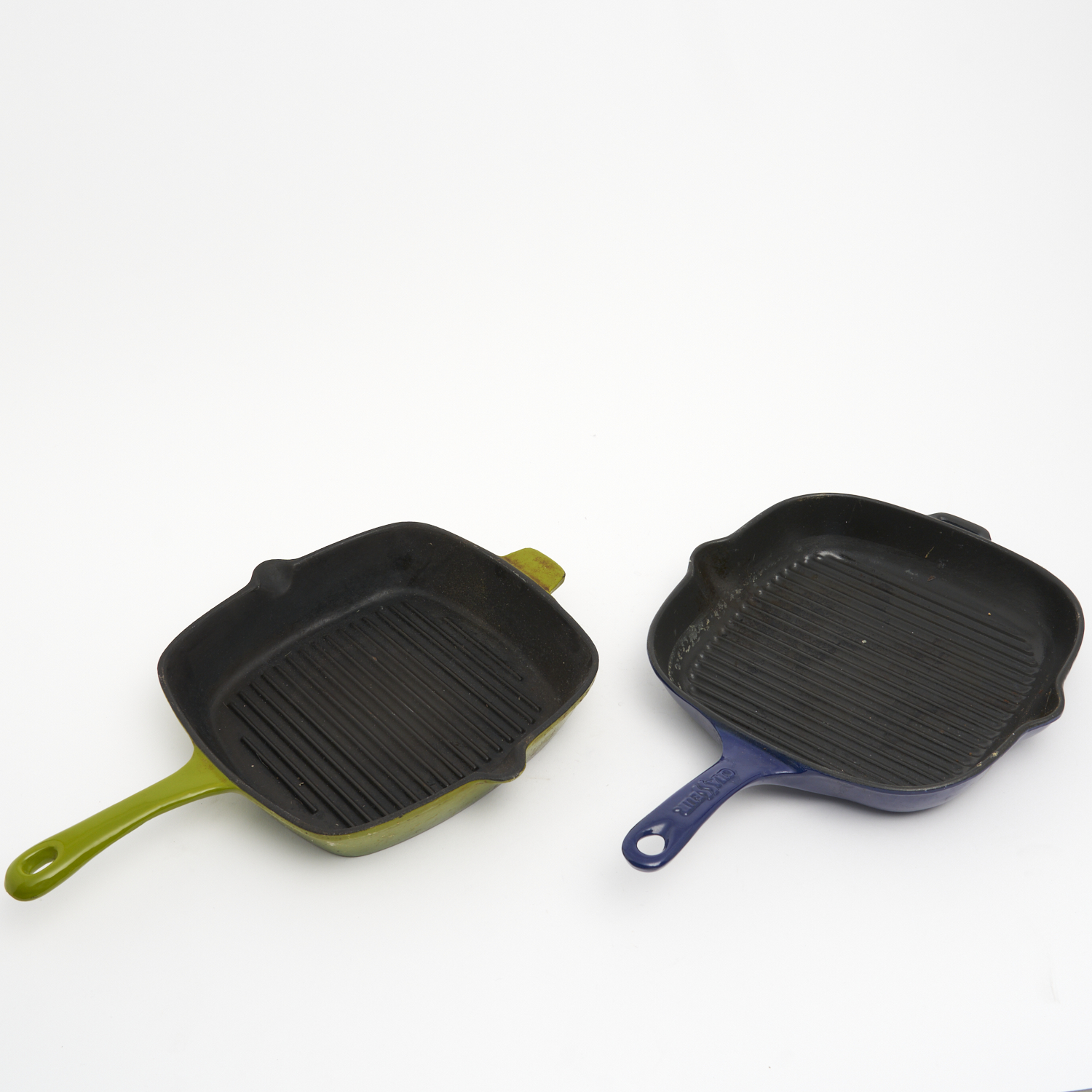 A BLUE CHASSEUR CAST IRON GRILL PAN TOGETHER WITH A GREEN CLASSICO CAST IRON GRILL PAN (A/F) W.28CM