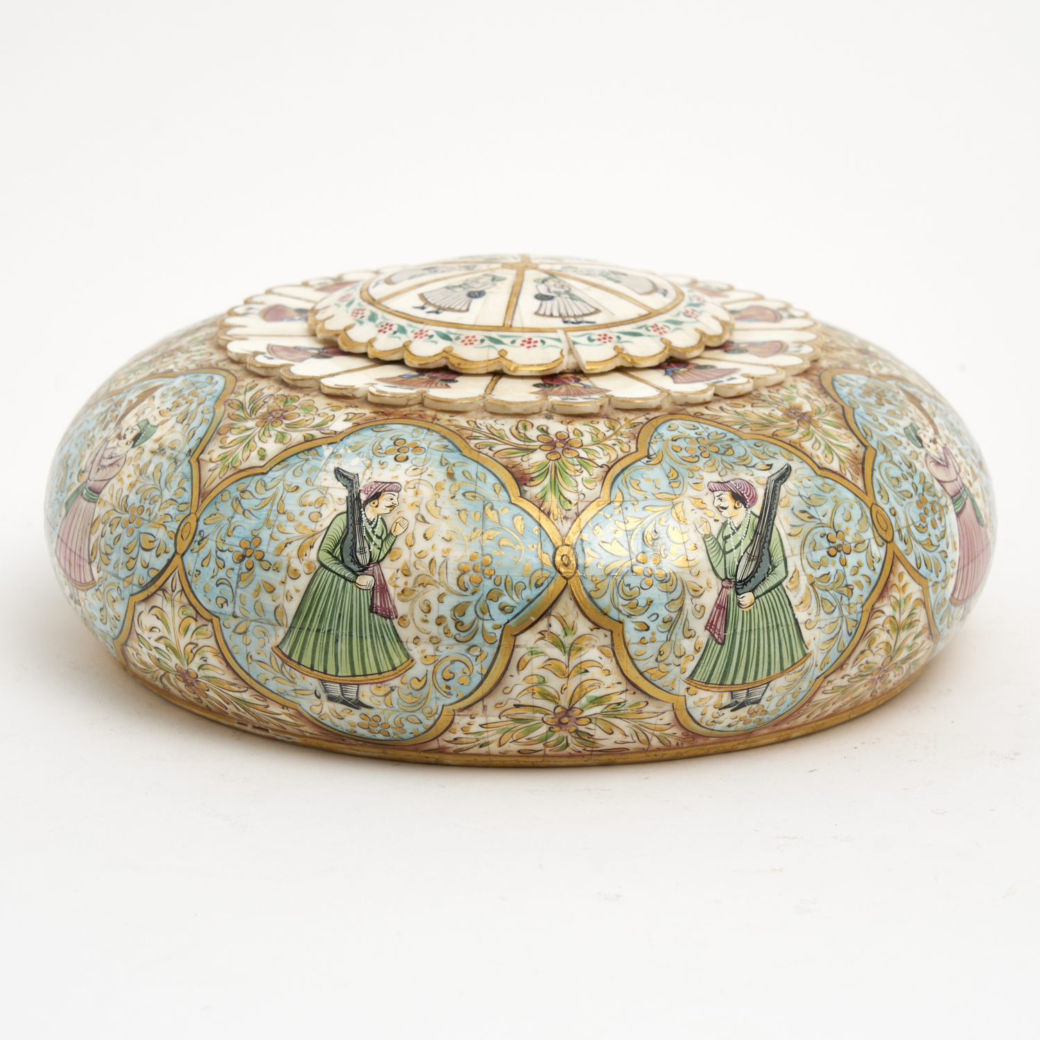 AN INDO-PERSIAN CARVED BONE ON WOOD CONTAINER WITH PAINTED RESERVES OF MUSICIANS (A/F) DIA.30CM