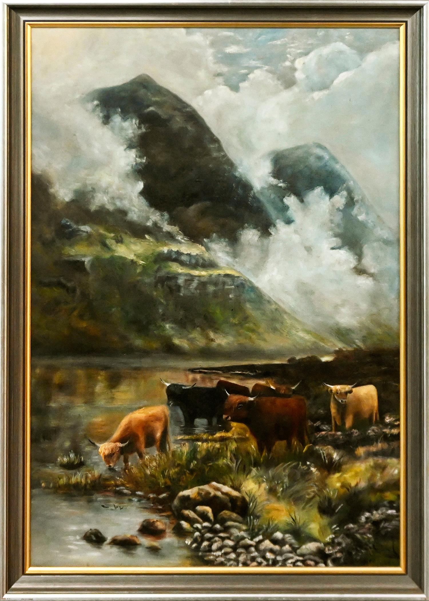 UNKNOWN ARTIST (SIGNED MGG), CATTLE IN SCOTTISH HIGHLANDS,
