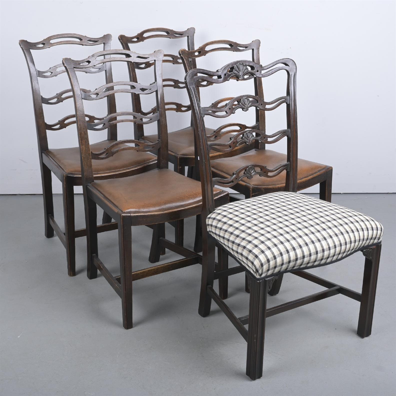 A SET OF FOUR GEORGIAN-STYLE DINING CHAIRS, WITH ANOTHER IN SIMILAR MANNER (A/F) (LARGEST 99H X 60W X 60D CM)