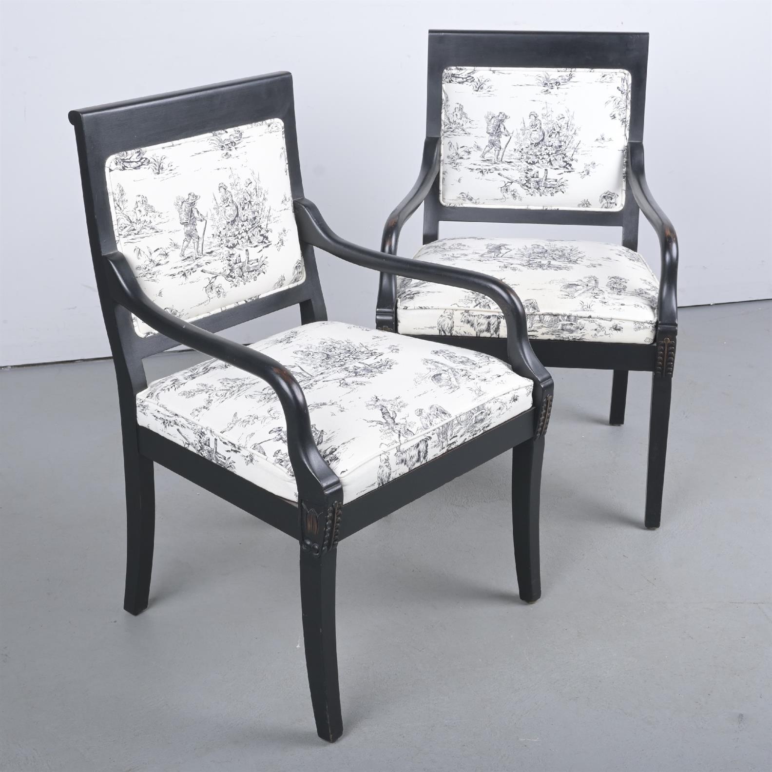 A PAIR OF BLACK PAINTED AND UPHOLSTERED ARMCHAIRS IN ANTIQUE MANNER (91H X 60W X 62D CM)