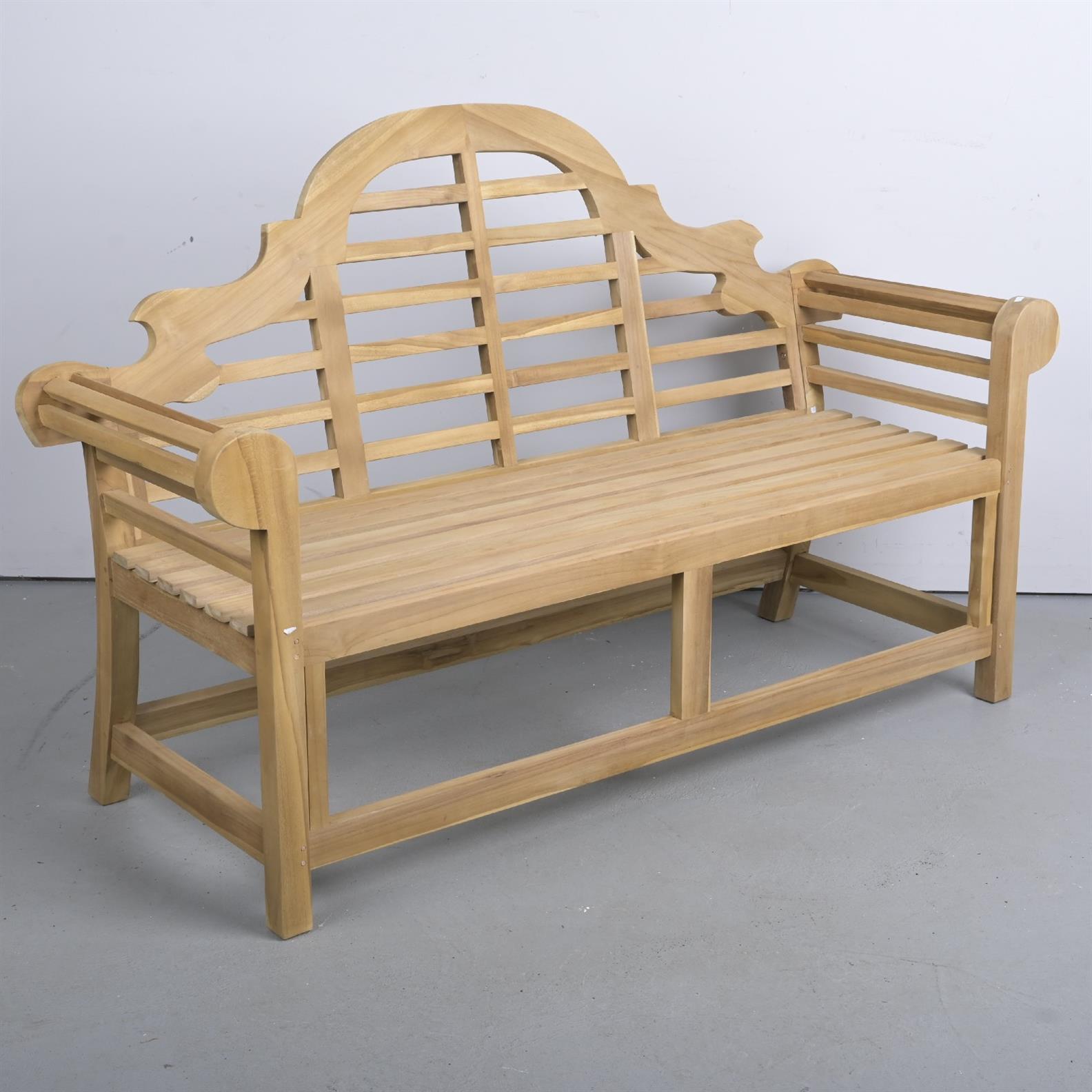 A LUTYENS STYLE TEAK BENCH SEAT (105H X 166W X 58D CM) (THIS ITEM MUST BE REMOVED BY CARRIERS AT THE CUSTOMER'S EXPENSE. LEONARD JOEL STAFF CANNOT ASSIST CARRYING THIS ITEM.)