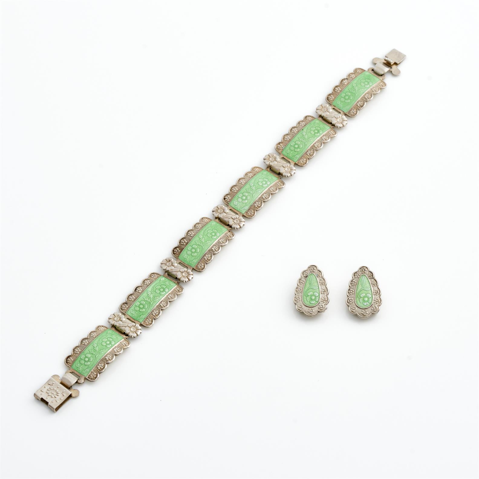 A VINTAGE ENGLISH GUILLOCHE ENAMEL JEWELLERY SUITE IN STERLING SILVER, COMPRISING OF A BRACELET, 185MM AND A PAIR OF EARRINGS TO CLIP FITTINGS