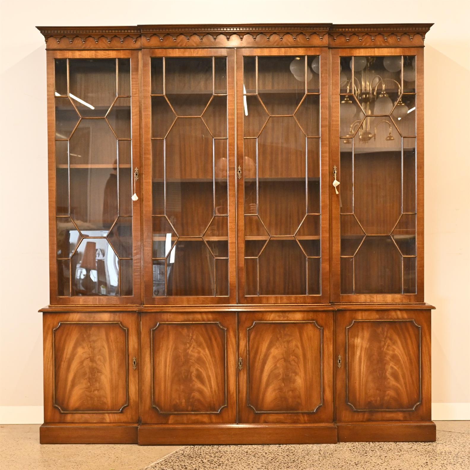 AN ENGLISH GEORGE III-STYLE MAHOGANY BREAK FRONT BOOK CASE WITH ADJUSTABLE SHELVES AND TWO KEYS (215H X 205W X 40D CM) (THIS ITEM MUST BE REMOVED BY CARRIERS AT THE CUSTOMER'S EXPENSE. LEONARD JOEL STAFF CANNOT ASSIST CARRYING THIS ITEM.)