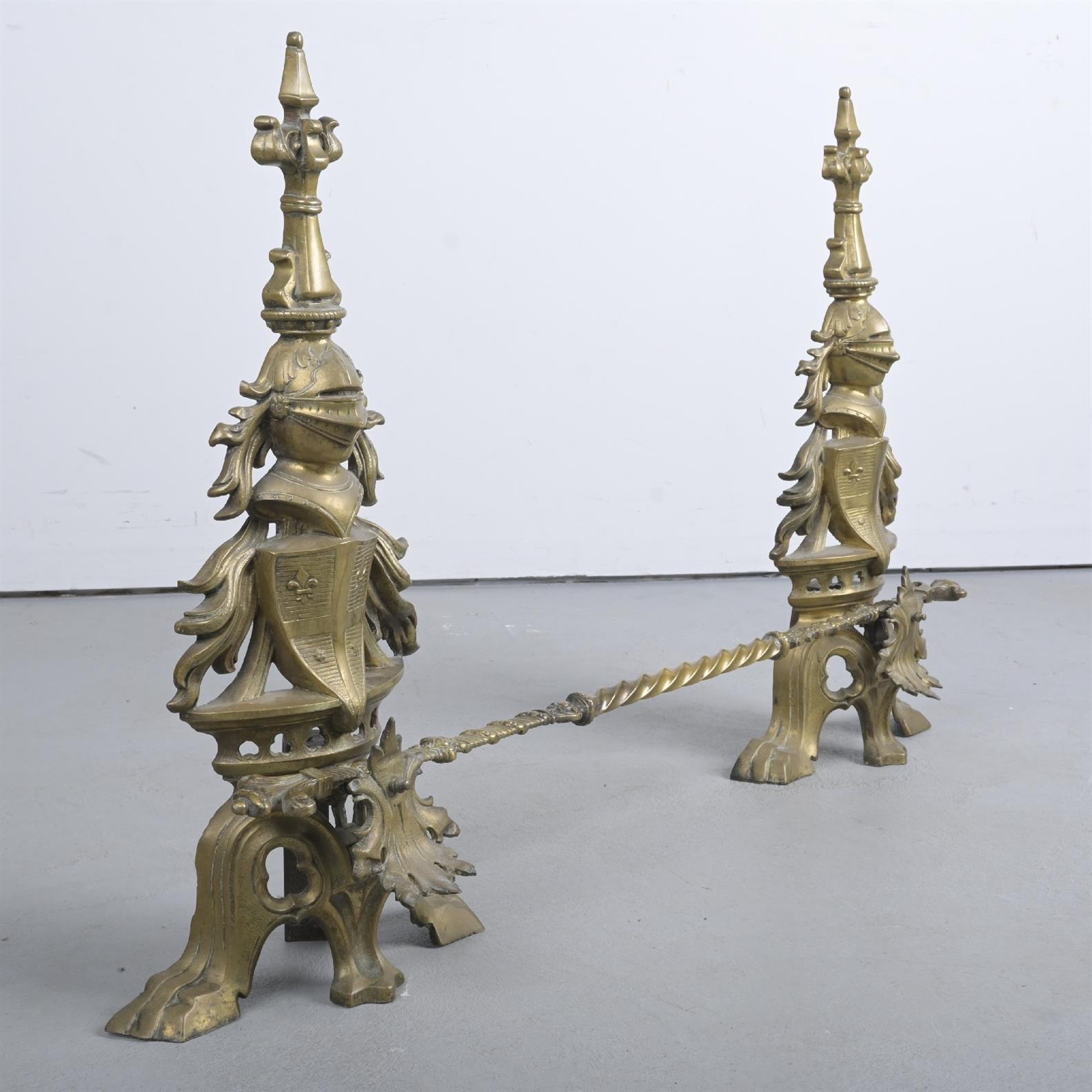 A PAIR OF LATE 19th CENTURY BRASS ANDIRONS WITH ACCOMPANYING RAIL IN ANTIQUARIAN STYLE (70H X 95W CM)