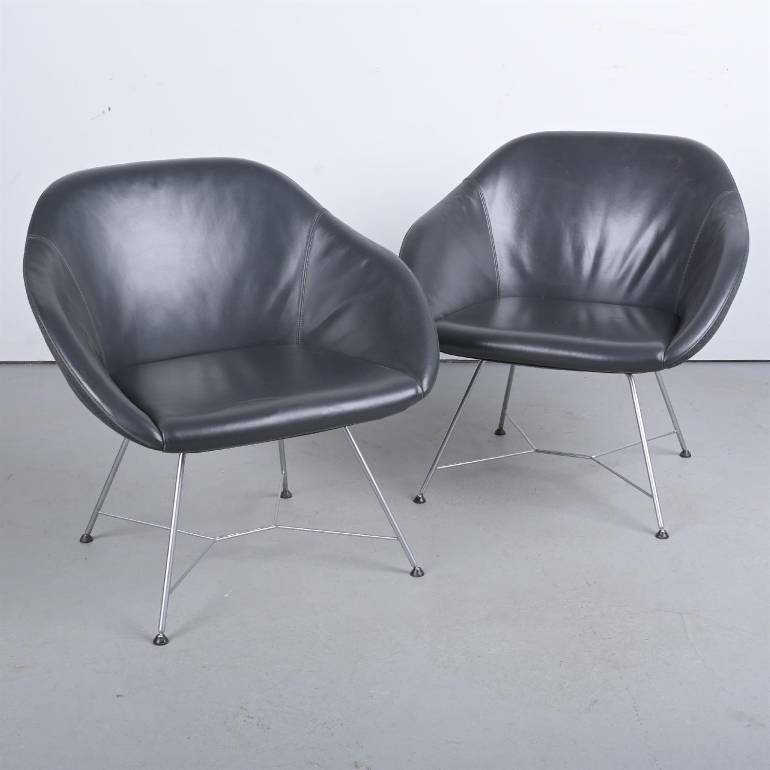 A PAIR OF LEATHER CHAIRS ON CHROME LEGS BY WALTER KNOLL (74H X 76W X 68D CM)