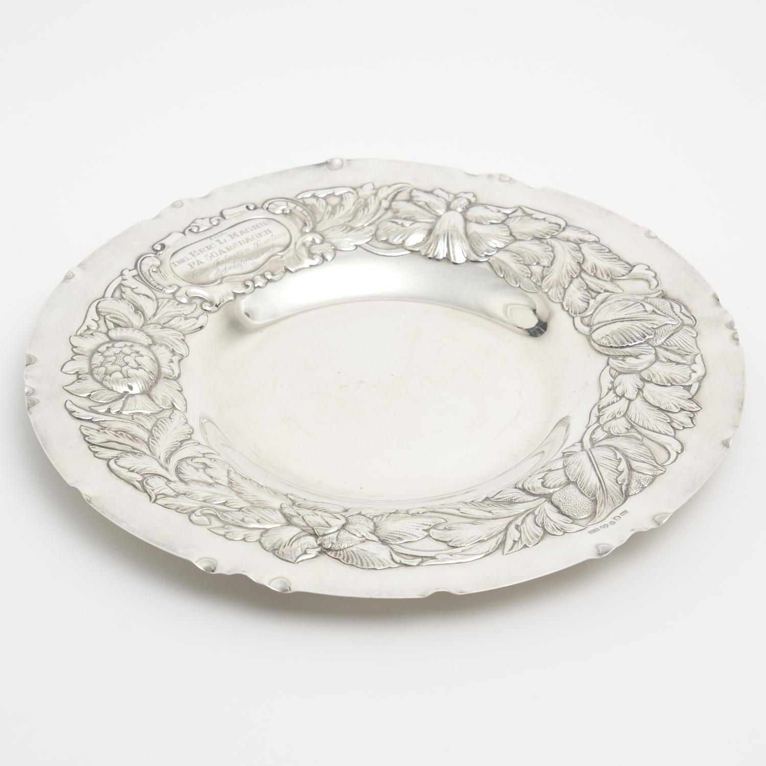 A SWEDISH SILVER EMBOSSED DISH, WITH PRESENTATION INSCRIPTION 588G DIA.36.5CM