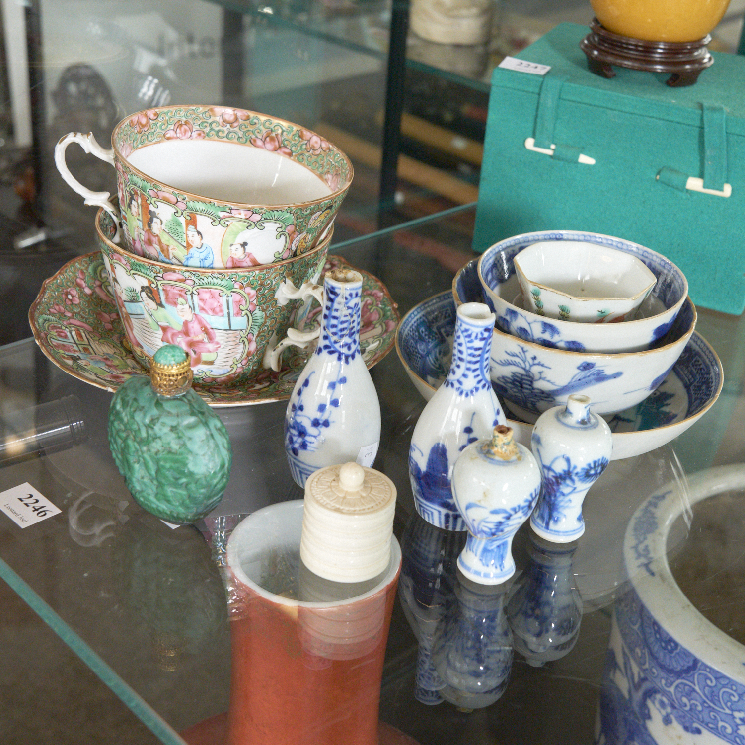 A COLLECTION OF CHINESE PORCELAIN INCLUDING CUPS, SAUCERS, DISHES AND BOTTLES (A/F) W.17CM (LARGEST SAUCER)