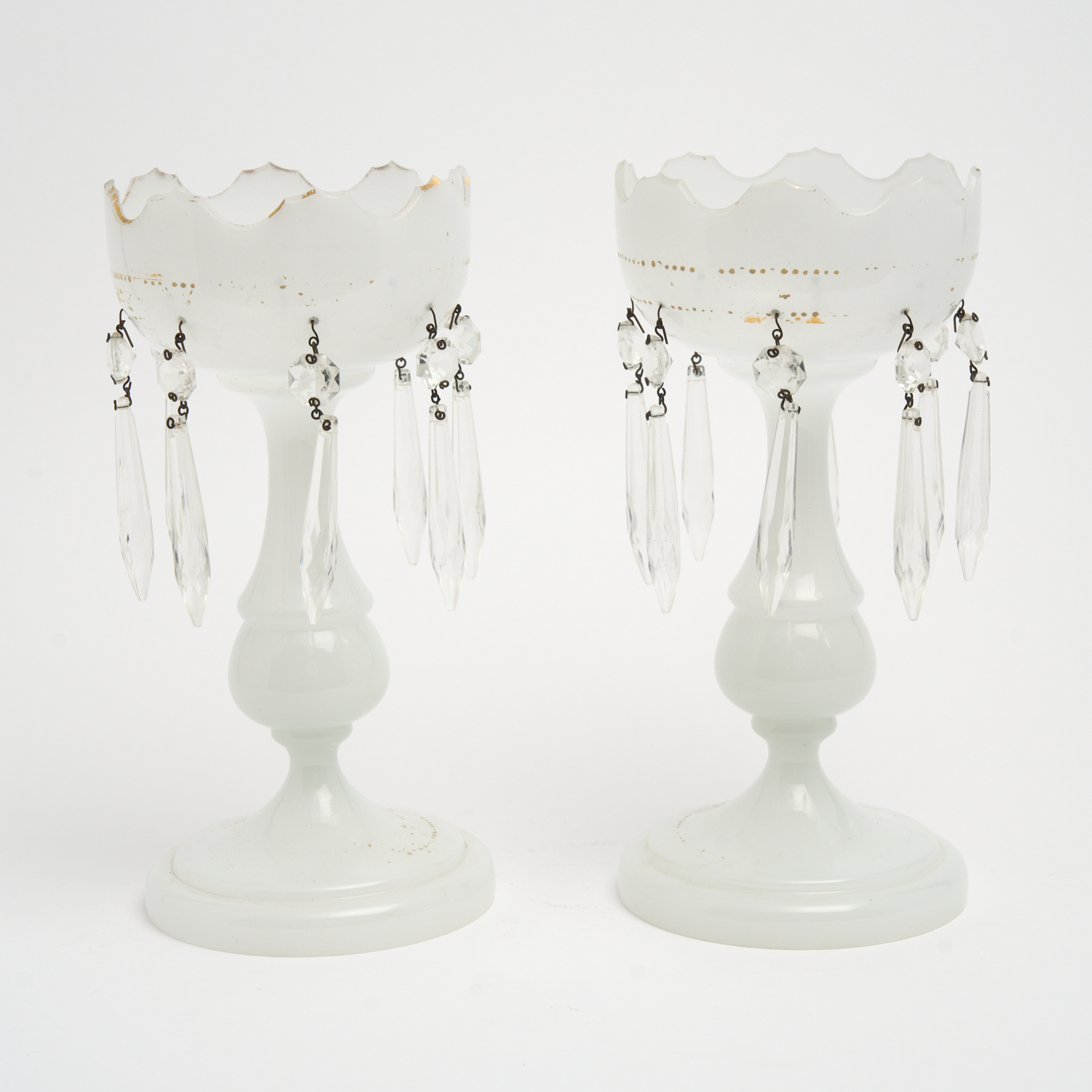 A PAIR OF VICTORIAN OPALINE CRYSTAL DROP LUSTRES (A/F) H.27.5CM