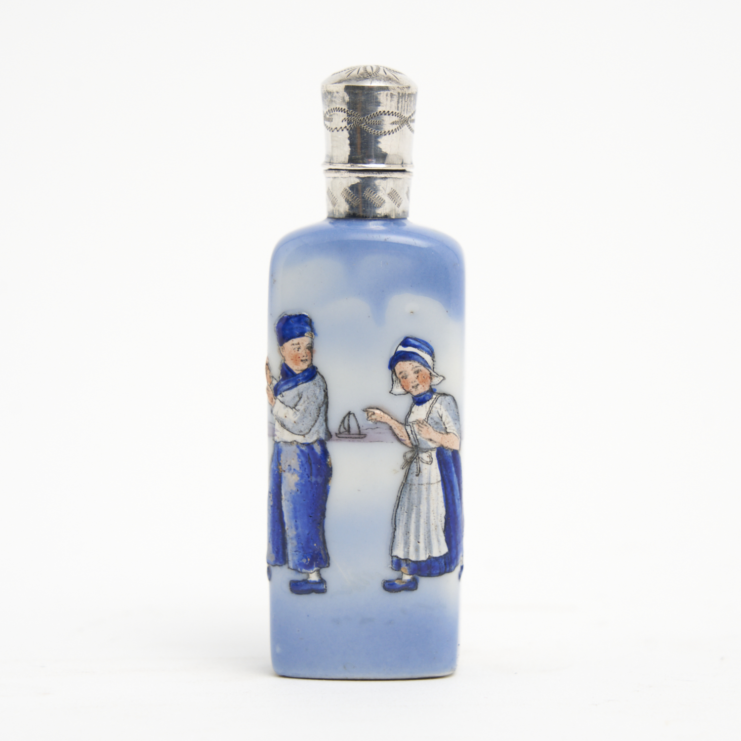 A LATE 19TH CENTURY SILVER TOPPED ENAMELLED DUTCH PORCELAIN PERFUME BOTTLE H.8.5CM