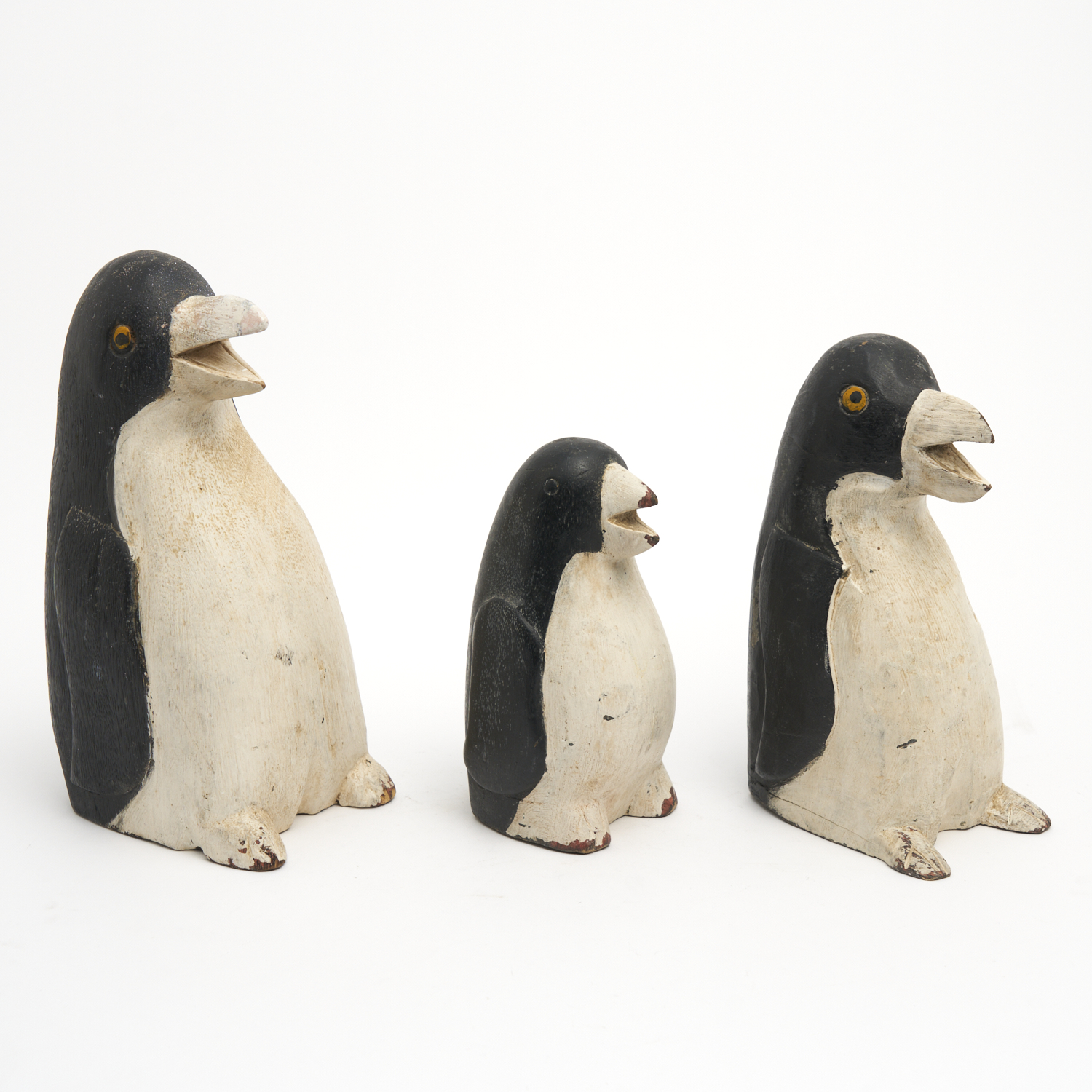 A GRADUATED TRIO OF VINTAGE HAND PAINTED CARVED WOODEN PENGUINS H.30CM (TALLEST)