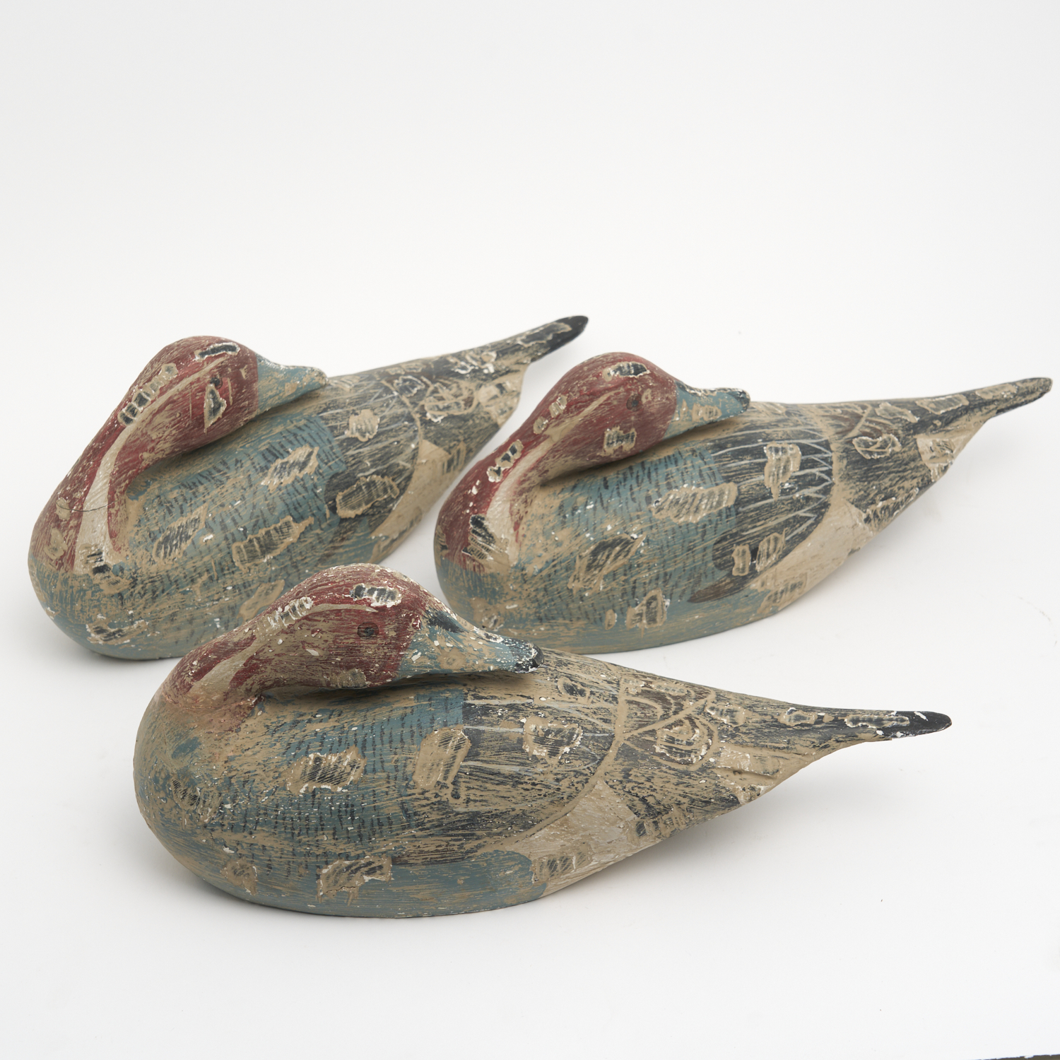 A GROUP OF THREE CARVED WOODEN DUCKS W.43CM (LARGEST)