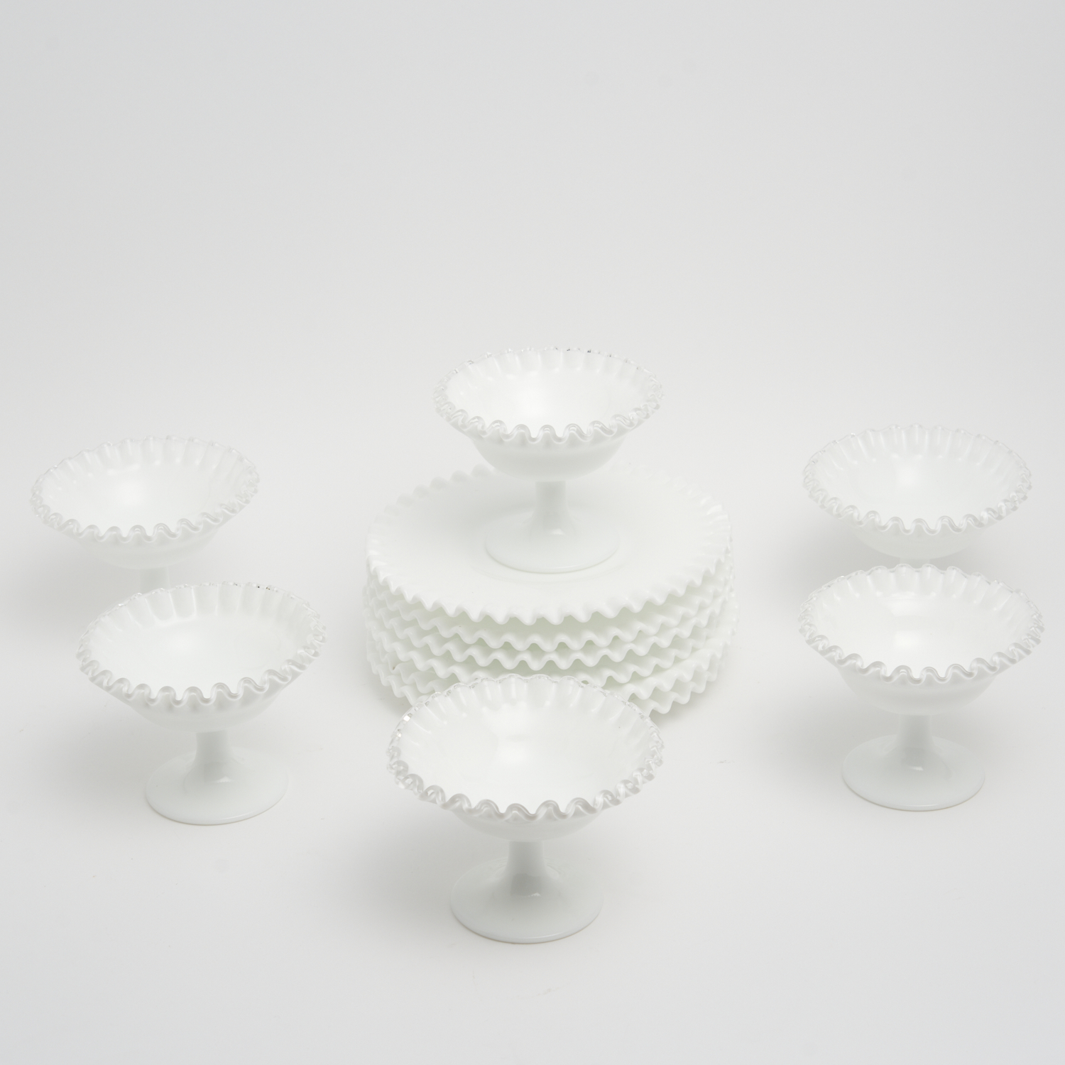 A SET OF SIX FENTON MILK GLASS DESSERT BOWLS AND UNDERPLATES H.10CM