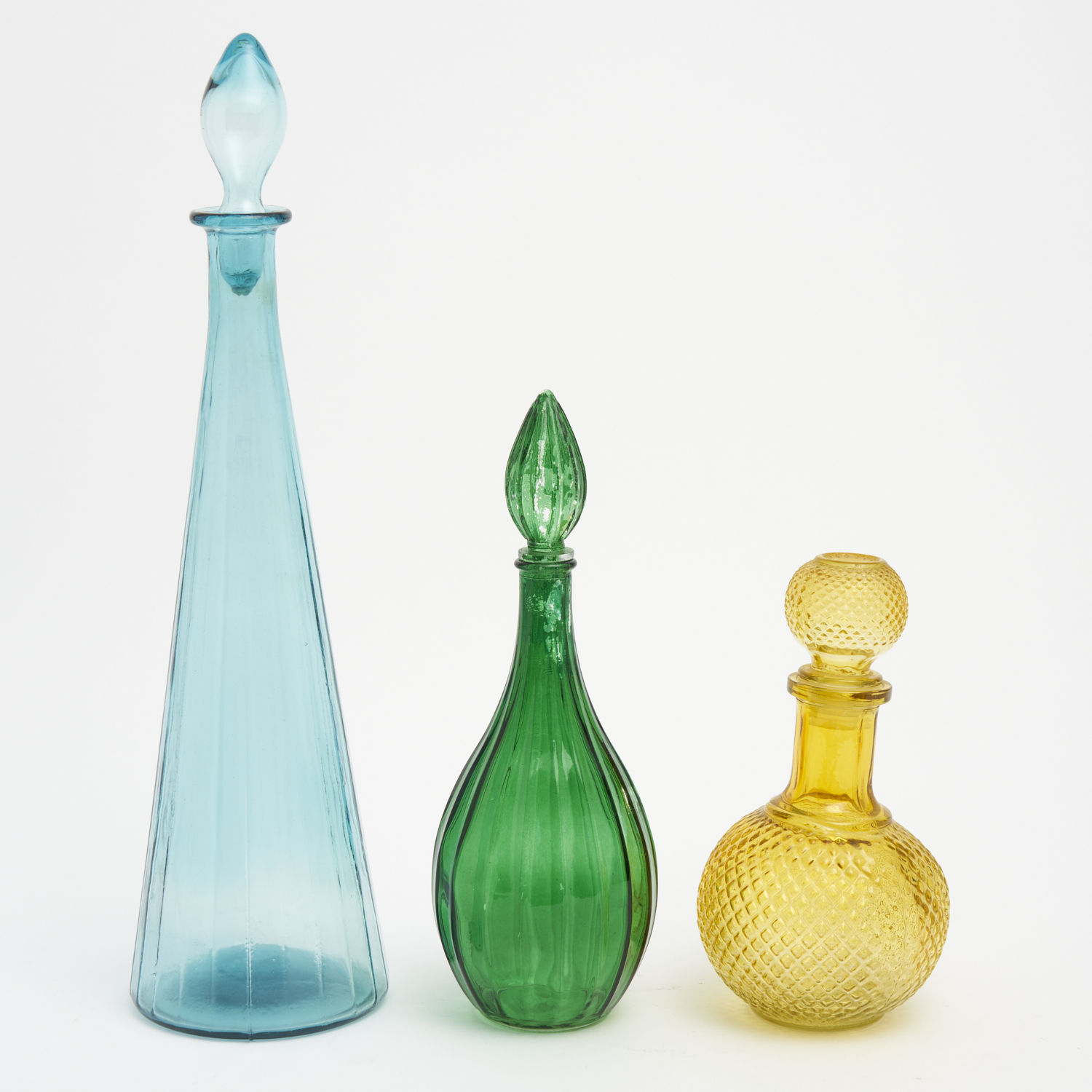 A GROUP OF THREE MULTICOLOURED GENIE BOTTLES (STOPPERS A/F) H.42CM (TALLEST)