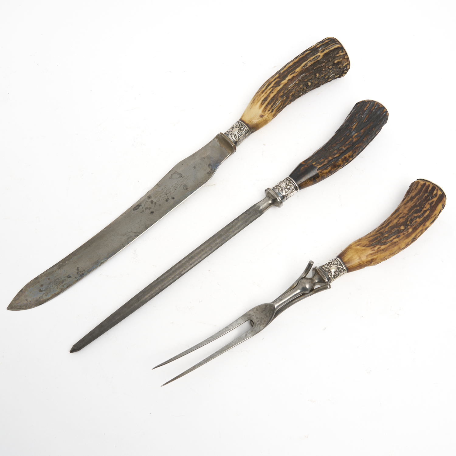 AN ANTLER HANDLED SILVER FERRULE SHEFFIELD CARVING SET L.37CM (LONGEST)