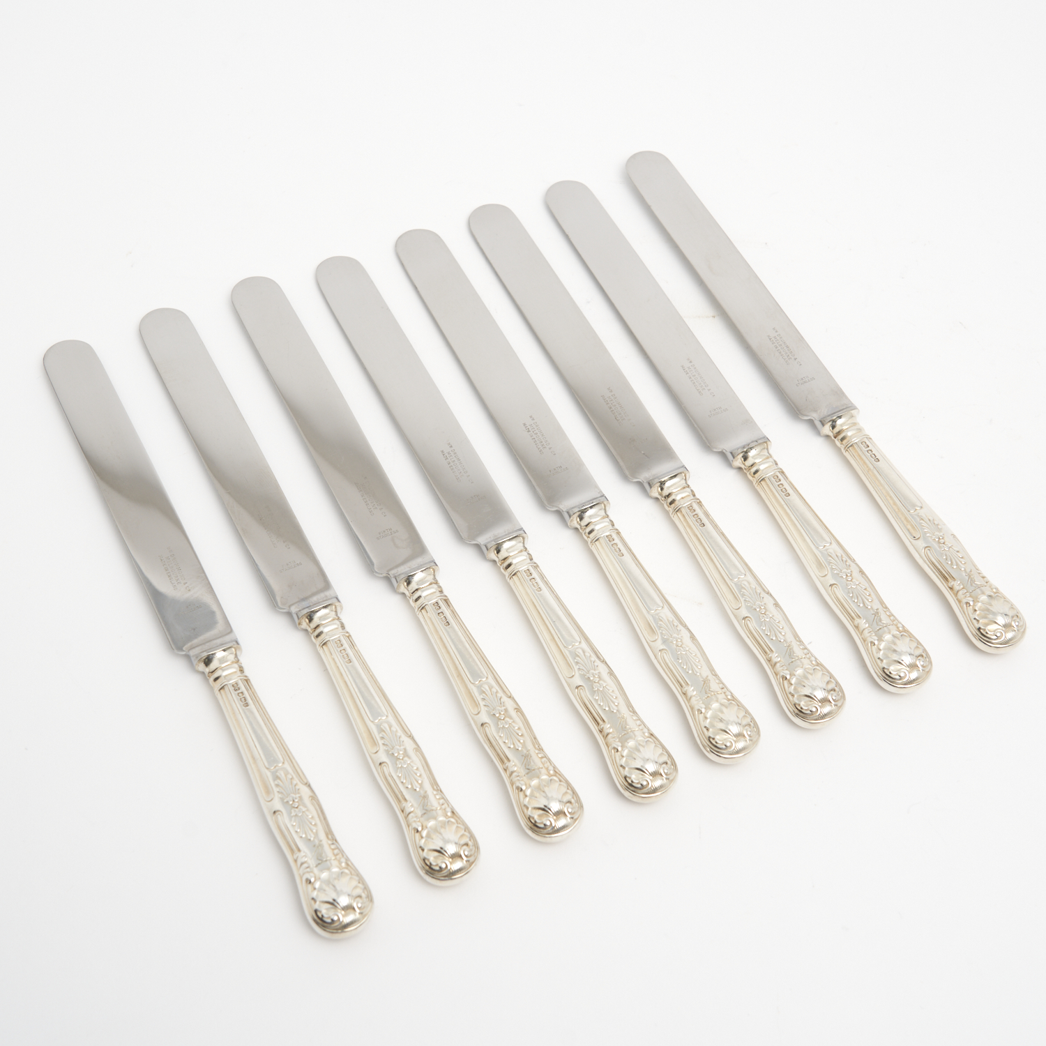 EIGHT ENGLISH STERLING SILVER KINGS PATTERN DINNER KNIVES, RETAILED BY W. DRUMMOND MELBOURNE L.25CM