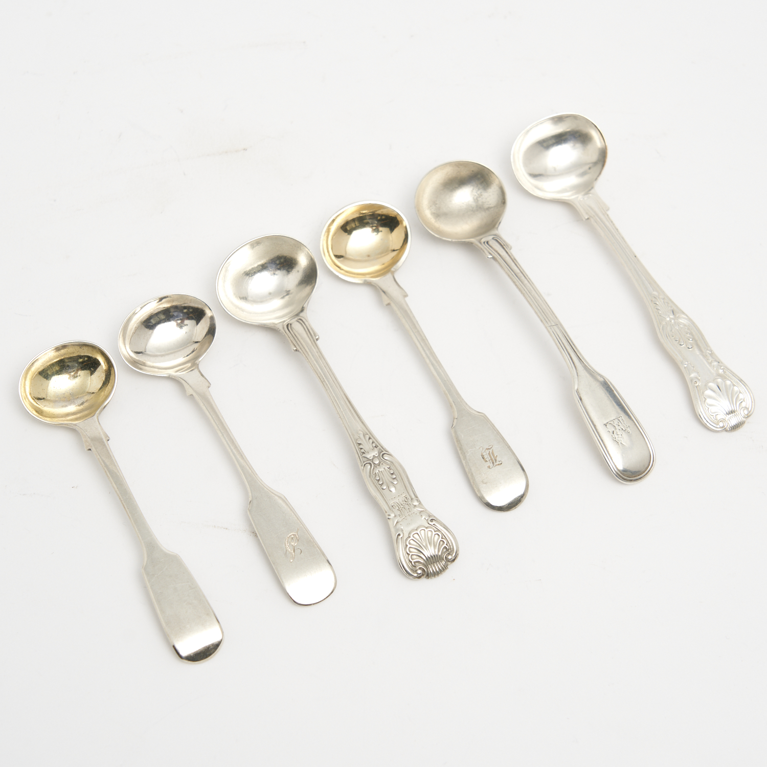 A GROUP OF SIX GEORGIAN STERLING SILVER MUSTARD AND SALT SPOONS INCLUDING PAIR OF KINGS PATTERN 101G L.11CM (LONGEST)