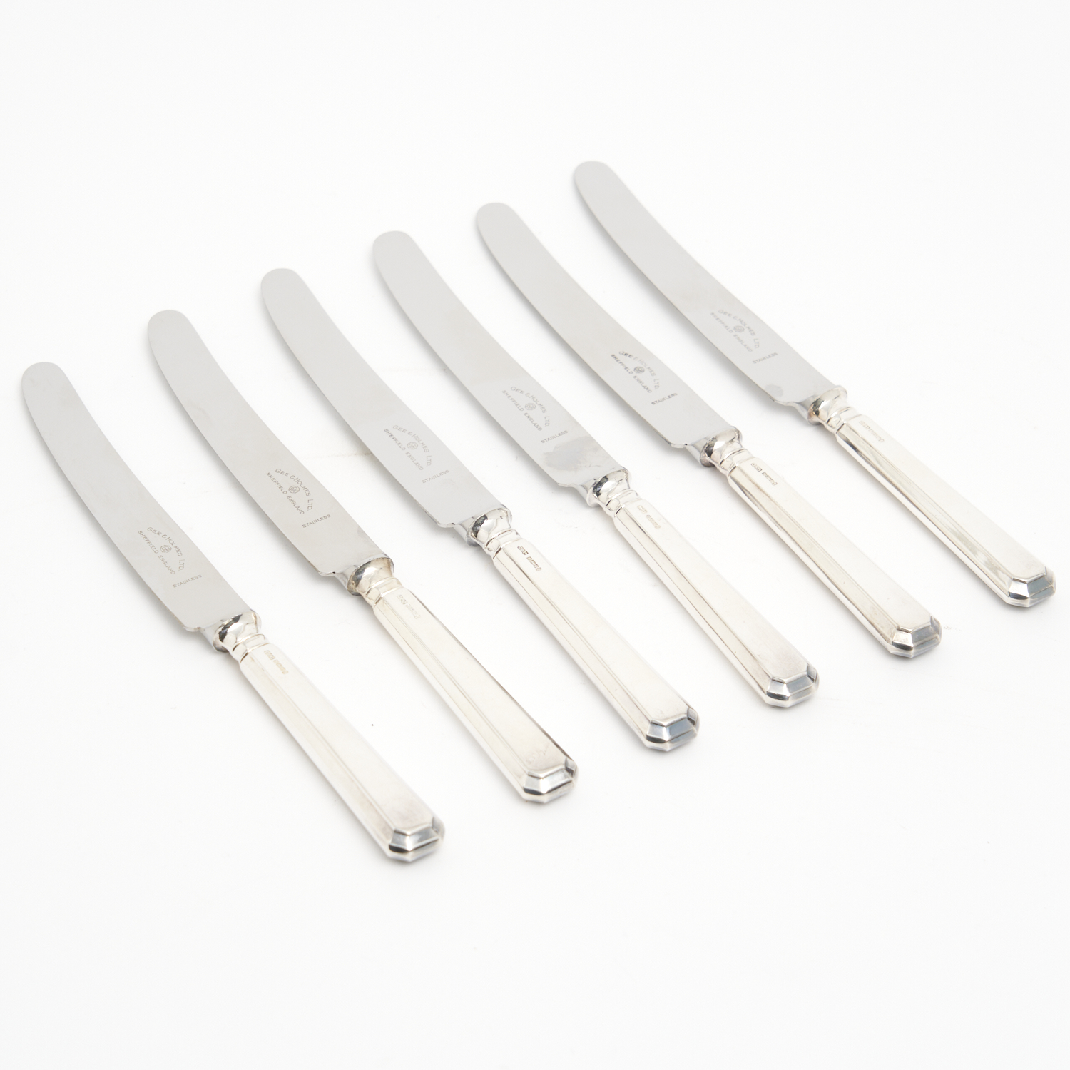 A SET OF SIX ENGLISH STERLING SILVER DINNER KNIVES, RETAILED BY G. HOLMES LTD SHEFFIELD ENGLAND L.24CM