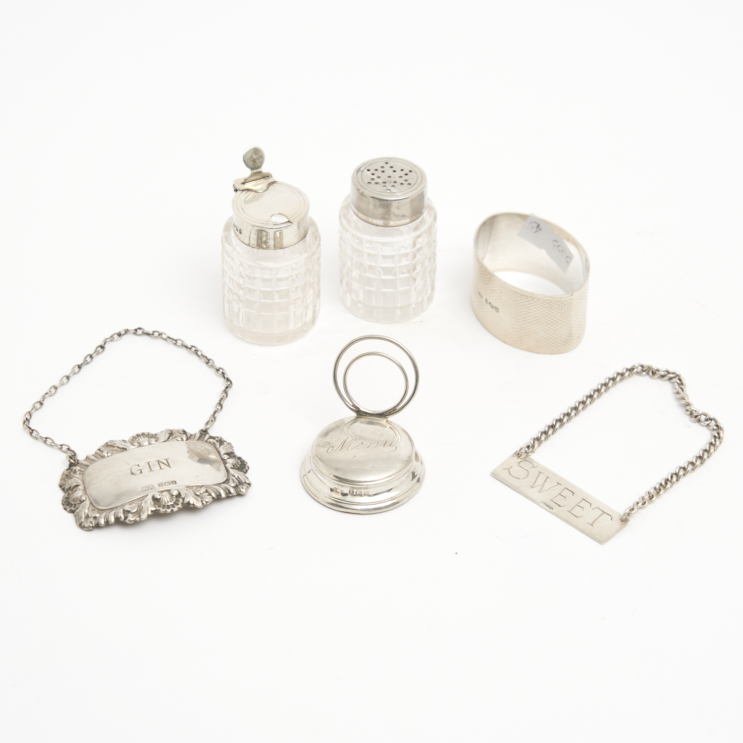 A COLLECTION OF ENGLISH STERLING SILVER OBJECTS INCLUDING SALT AND PEPPER, NAPKIN RING, DECANTER LABELS, AND A MENU HOLDER W.6CM (LARGEST)