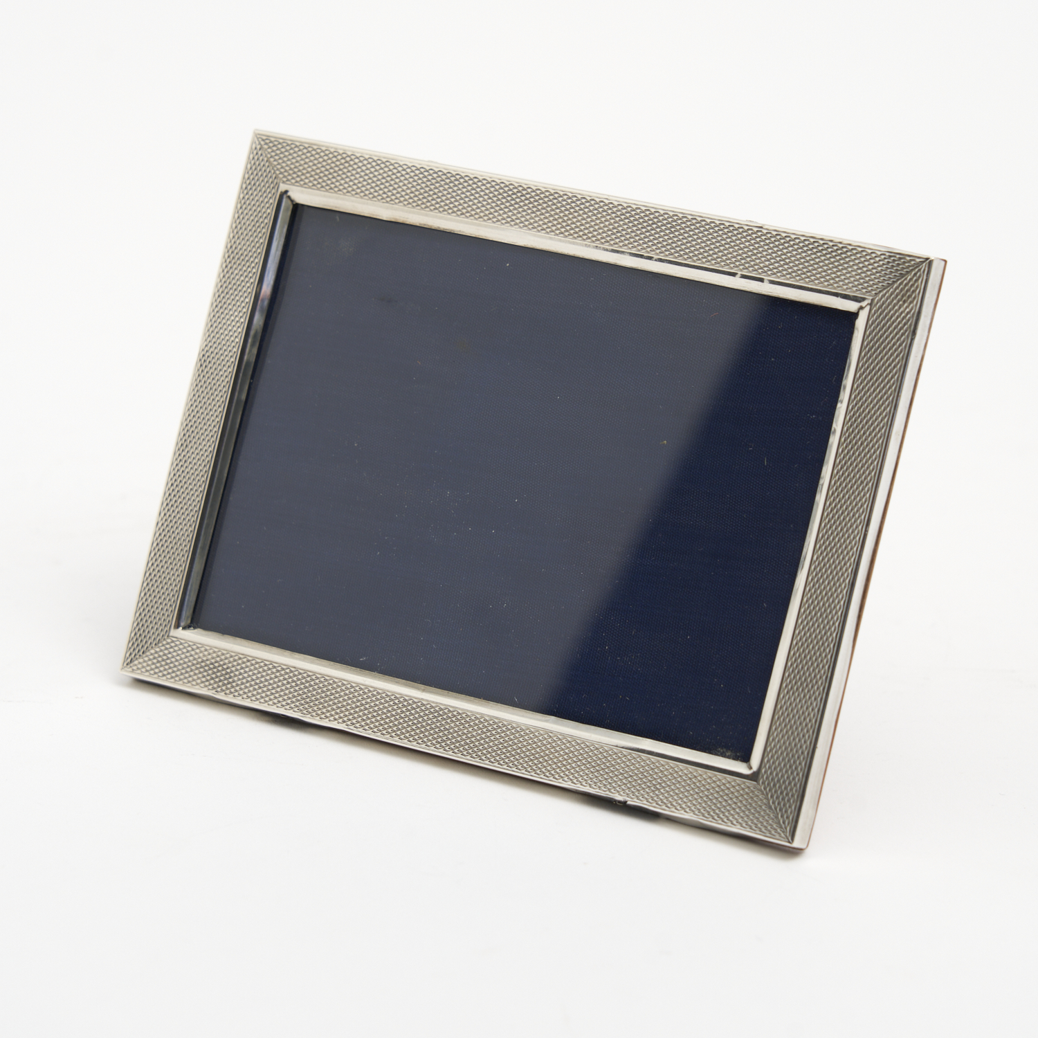 A STERLING SILVER PICTURE FRAME WITH ORIGINAL WOODEN BACKING AND ENGINE TURNED DESIGN W.15CM