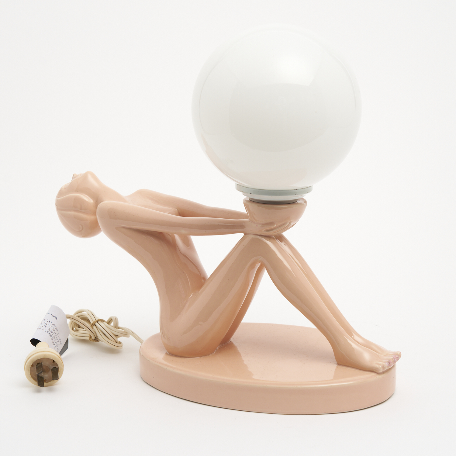 A MID CENTURY GLAZED ITALIAN PINK PORCELAIN LADY LAMP RETAILED BY SAYWELL IMPORTS W.36CM