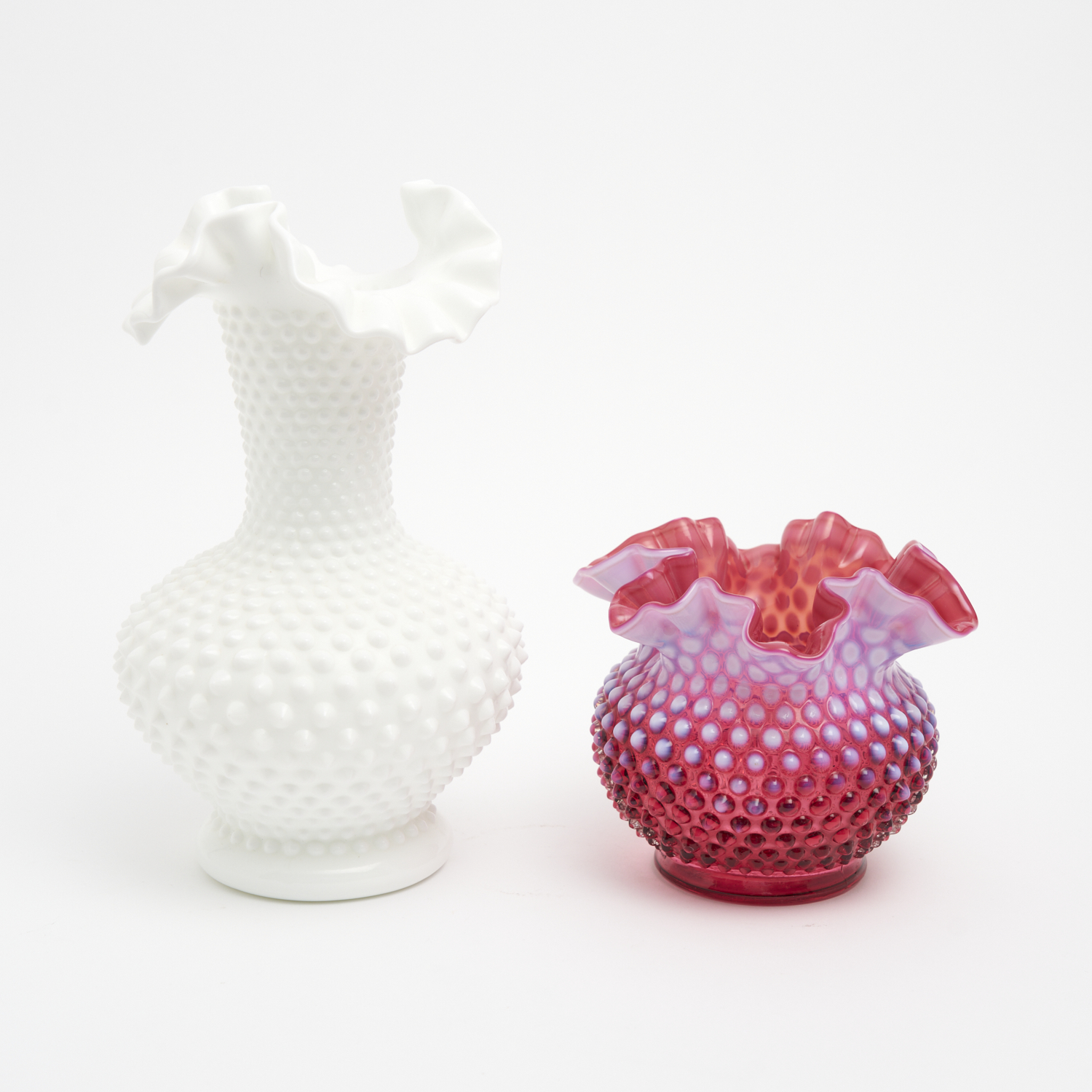 TWO FENTON RUBY AND WHITE GLASS DIMPLE VASES 27.5CM (TALLEST)