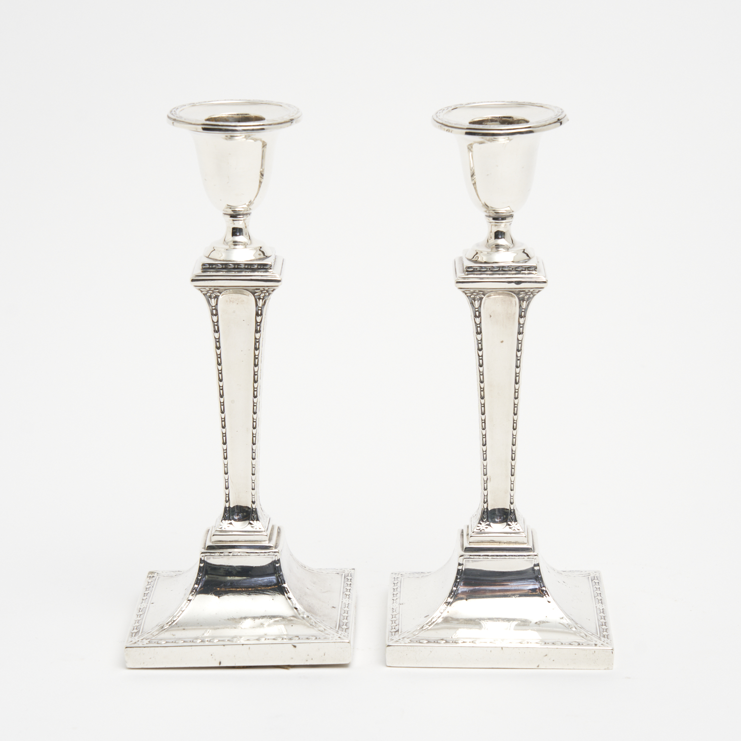 A PAIR OF HALLMARKED ENGLISH STERLING SILVER ADAMS STYLE CANDLESTICKS H.22CM