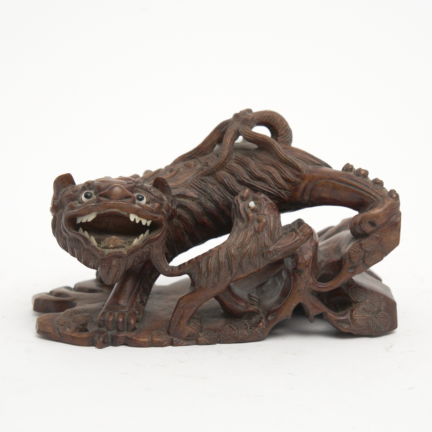 A CHINESE REPUBLIC PERIOD ROSEWOOD DOUBLE SHISHI DOG FIGURE, SIGNED TO BASE W.16CM