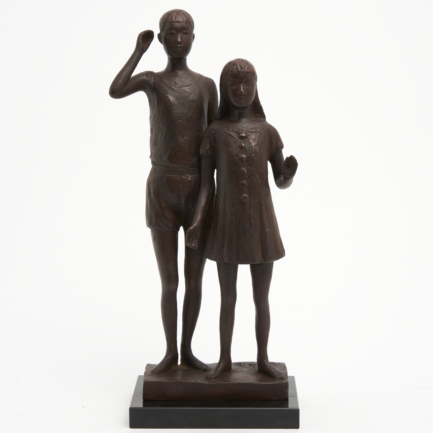 A CHINESE CAST IRON MARBLE BASED FIGURE OF FATHER AND CHILD H.41CM