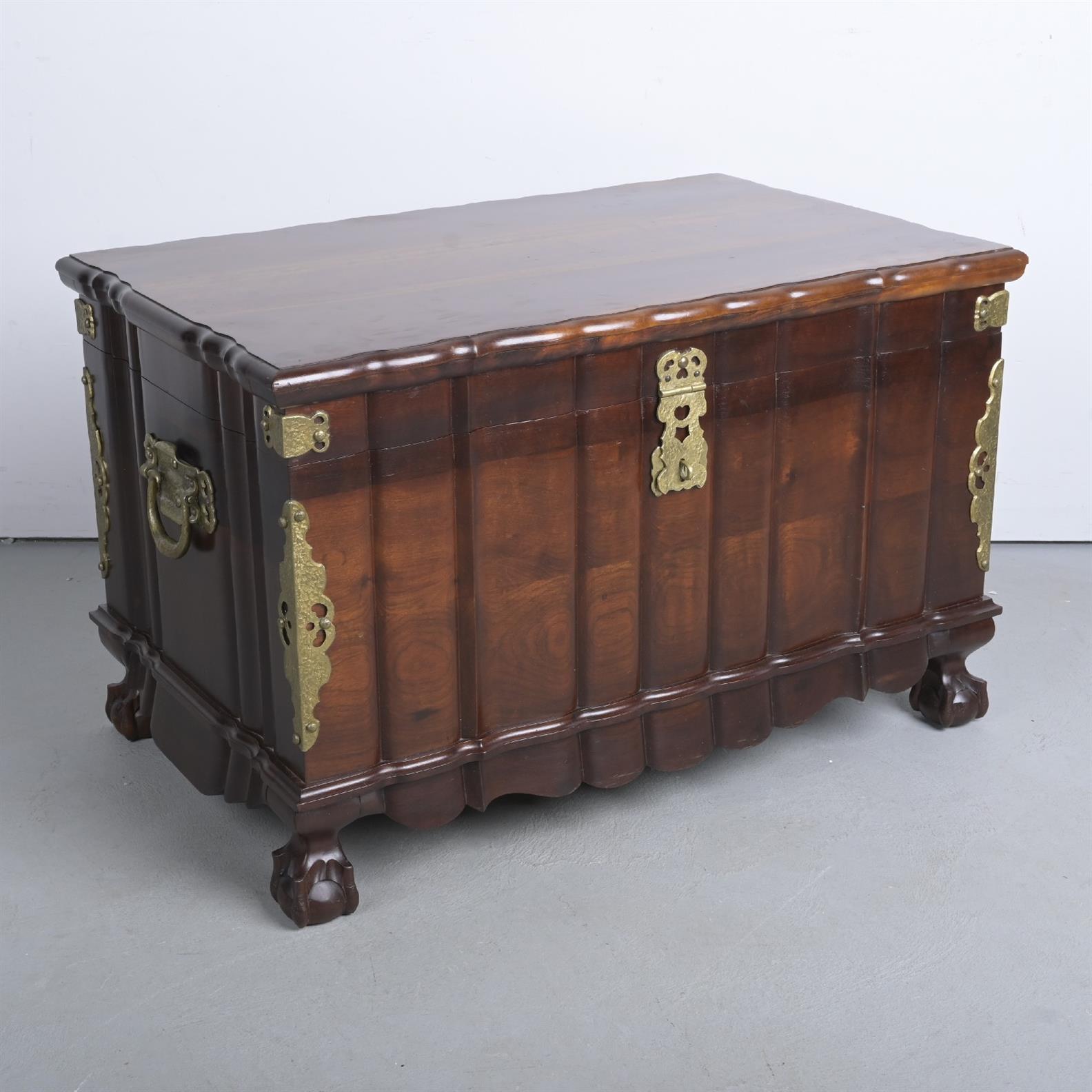 A LARGE BRASS BOUND TRUNK IN ANTIQUE MANNER (65H X 102W X 65D CM) (THIS ITEM MUST BE REMOVED BY CARRIERS AT THE CUSTOMER'S EXPENSE. LEONARD JOEL STAFF CANNOT ASSIST CARRYING THIS ITEM.)