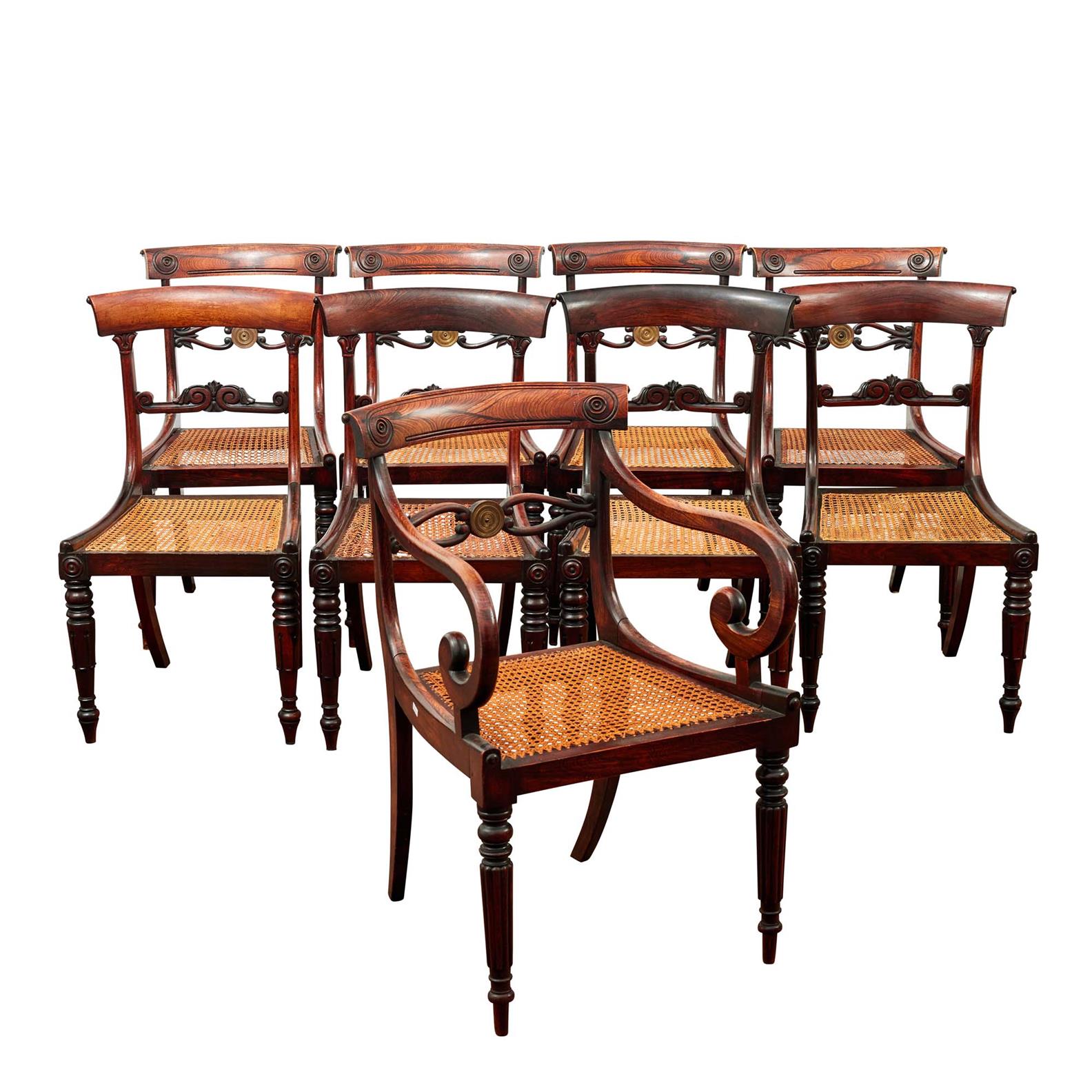 Including four George IV rosewood examples on lappeted front legs and five late Georgee II chairs grained as rosewood with brass mounts including one elbow chair, all with caned seats.