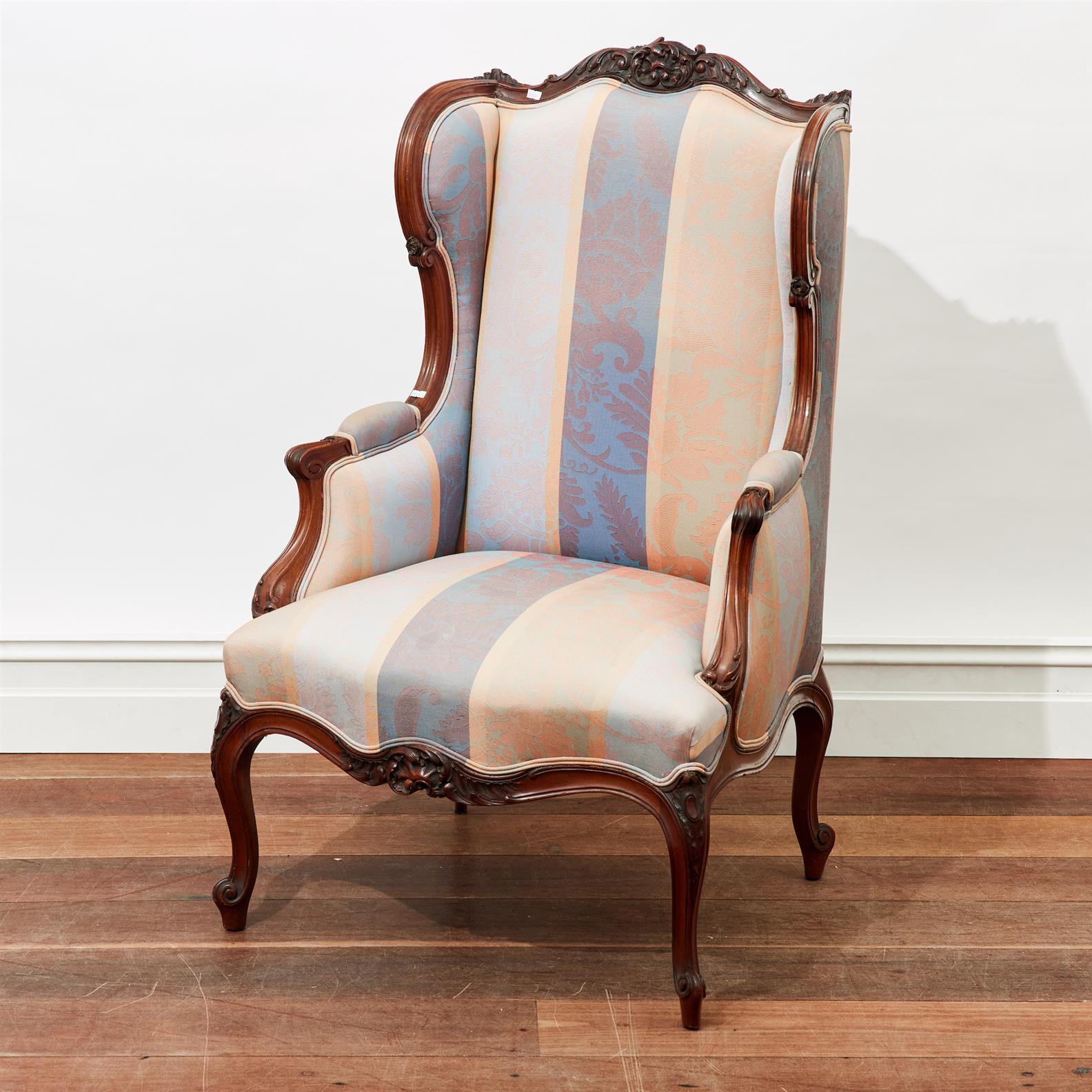 A 19TH CENTURY WALNUT BERGERE A'LOREILLES IN THE LOUIS XV STYLE WITH ROCAILLE CARVED TOP RAIL IN BROAD STRIPED BROCADE