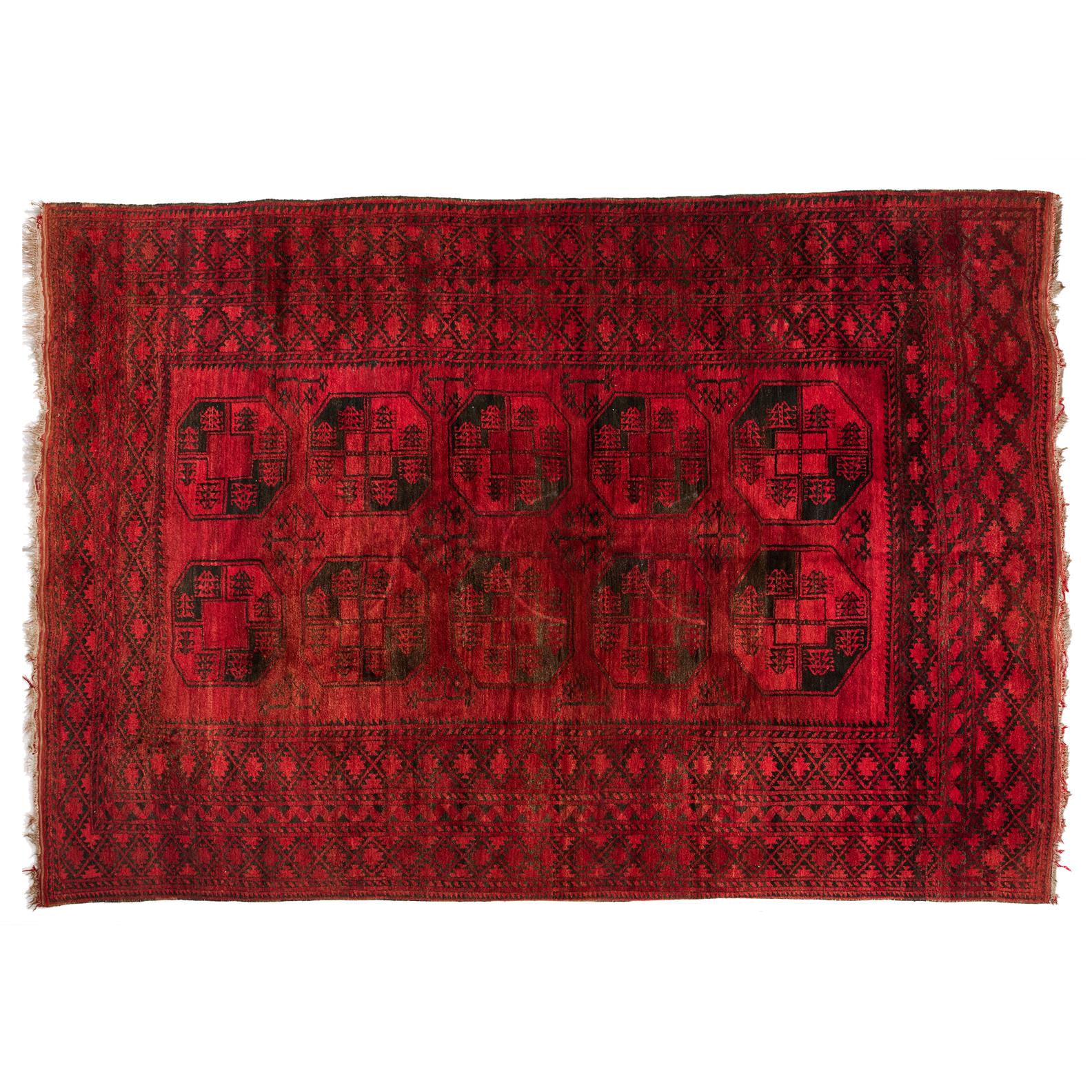 AN AFGHAN CARPET WITH TEN QUARTERED MEDALLIONS ON A RED FIELD WITHIN MULTIPLE GEOMETRIC BORDERS