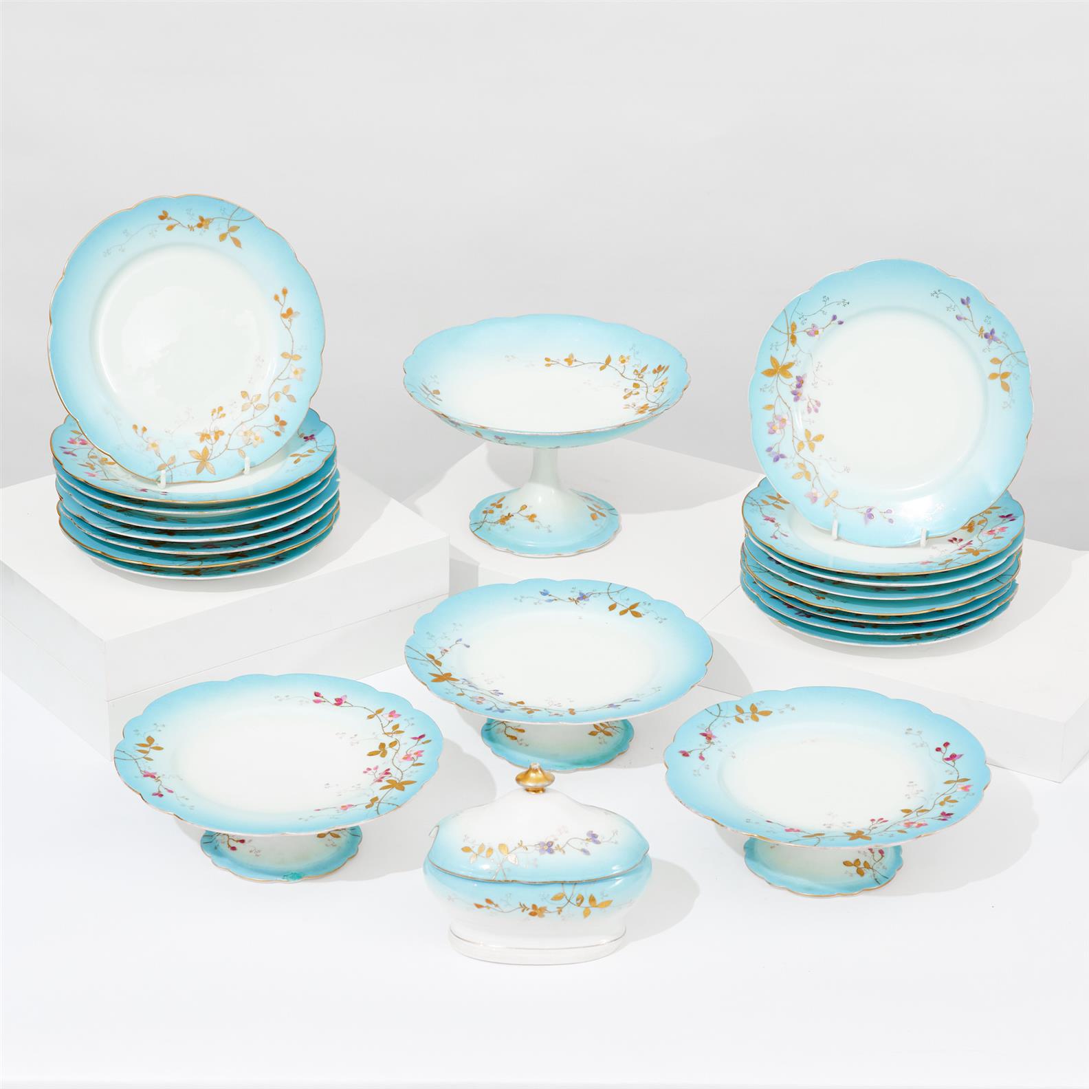 A LATE 19TH CENTURY FRENCH PORCELAIN DESSERT SERVICE OF THREE FLAT AND ONE DEEP COMPORTS, SIXTEEN PLATES AND A COVERED SUGAR BASIN ALL DECORATED WITH GILT AND MAUVE FLOWERS ON PALE BLUE